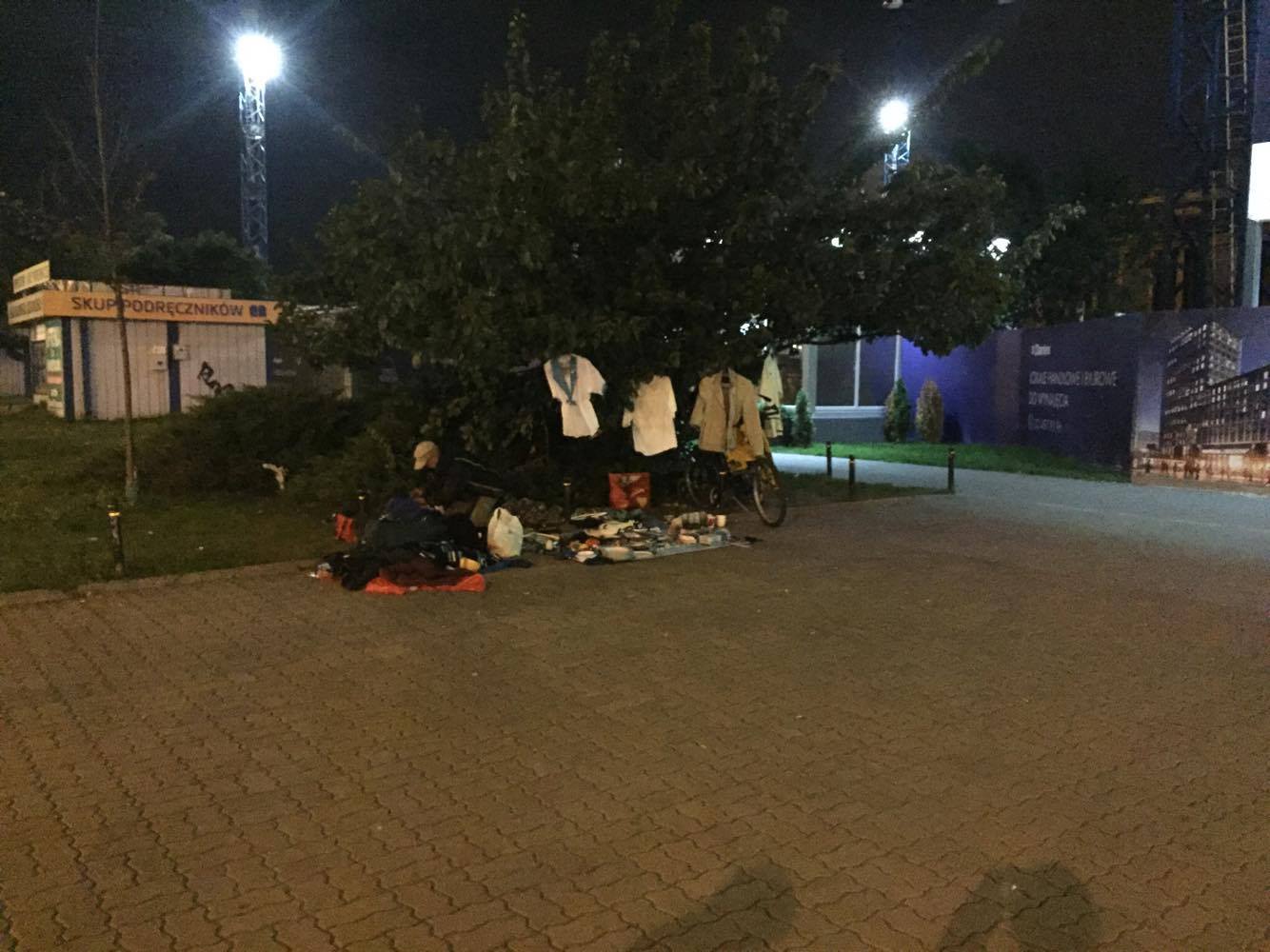Po zburzeniu Uniwersamu bezdomni sprzedający używane rzeczy wokół budynku przenieśli się na okoliczne skwery i trawniki. Ubrania, którymi handlują wiszą na drzewach. Nikomu nie wadzą. Byli tu od kiedy pamiętam – taki lokalny folklor. Ostatnio jednak zauważyliśmy coś, co nas bardzo zaniepokoiło. Wracając w nocy do domu zobaczyliśmy, że prowizoryczny stragan nie zniknął jak zwykle na noc, a pod drzewem śpią ludzie.