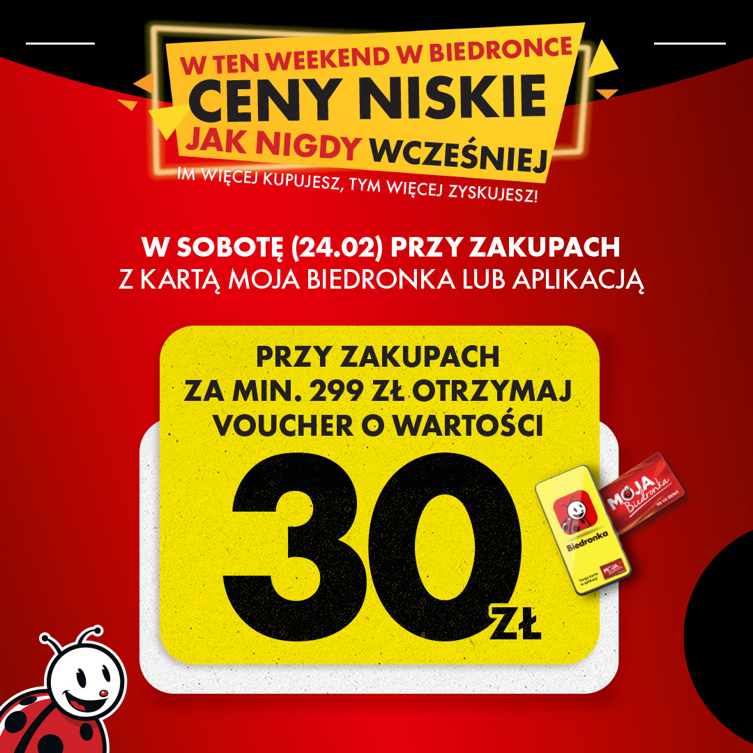 SOBOTA, 24 lutego 2024 r. – Sieć sklepów Biedronka wprowadza wyjątkową promocję, która ma przyciągnąć klientów do robienia większych zakupów w weekend. Tylko w tę sobotę, każdy, kto zdecyduje się na zakupy za minimum 299 zł, otrzyma voucher o wartości 30 zł, który będzie mógł wykorzystać w kolejne zakupy już w poniedziałek.