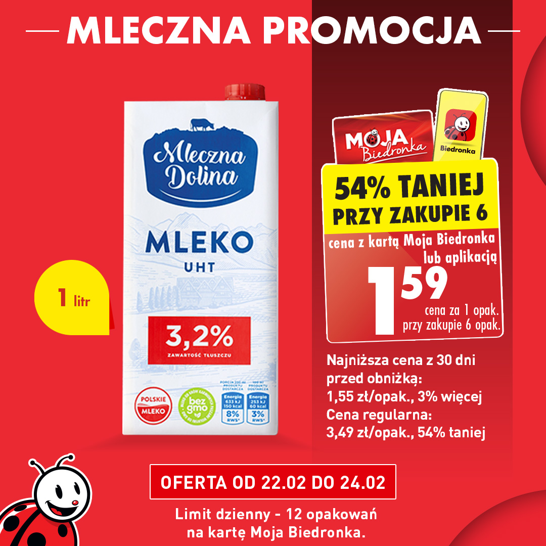 W świecie pełnym drożejących produktów, sieć supermarketów Biedronka przychodzi z ofertą, która sprawia, że klienci przecierają oczy ze zdumienia. W dniach od 22 do 24 lutego Biedronka postanowiła obniżyć cenę mleka UHT o zawartości tłuszczu 3,2% marki Mleczna Dolina. Jednolitrowe opakowanie tego polskiego mleka będzie można nabyć w wyjątkowo atrakcyjnej cenie 1,59 zł, ale jest mały haczyk – obniżka dotyczy zakupu sześciu opakowań.