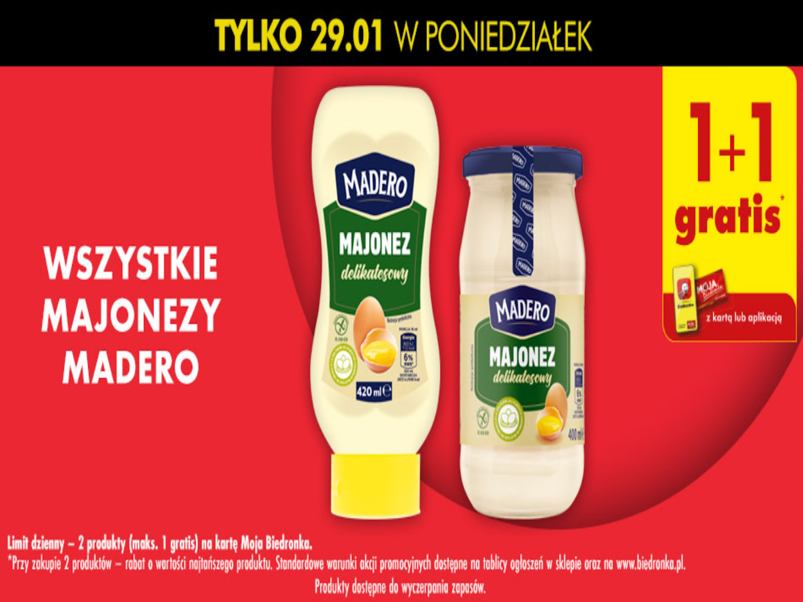 Wystarczy w poniedziałek, 29 stycznia, udać się do najbliższego sklepu Biedronka, wybrać dwa produkty marki Madero i przy kasie pokazać kartę Moja Biedronka lub skorzystać z aplikacji. Drugi produkt – tańszy lub równowartościowy – otrzymasz całkowicie za darmo.
