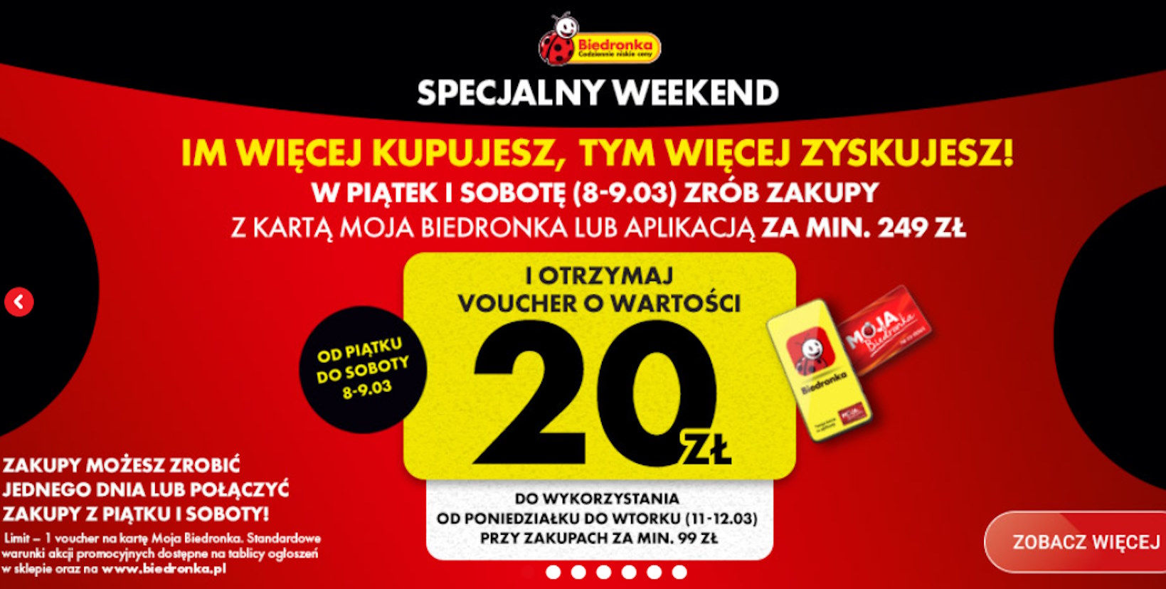 Zakupy zrobione w piątek lub sobotę mogą uprawniać do otrzymania bonu o wartości 20 złotych, który będzie można wykorzystać od poniedziałku do wtorku przy minimalnej kwocie zakupów wynoszącej 99 złotych.