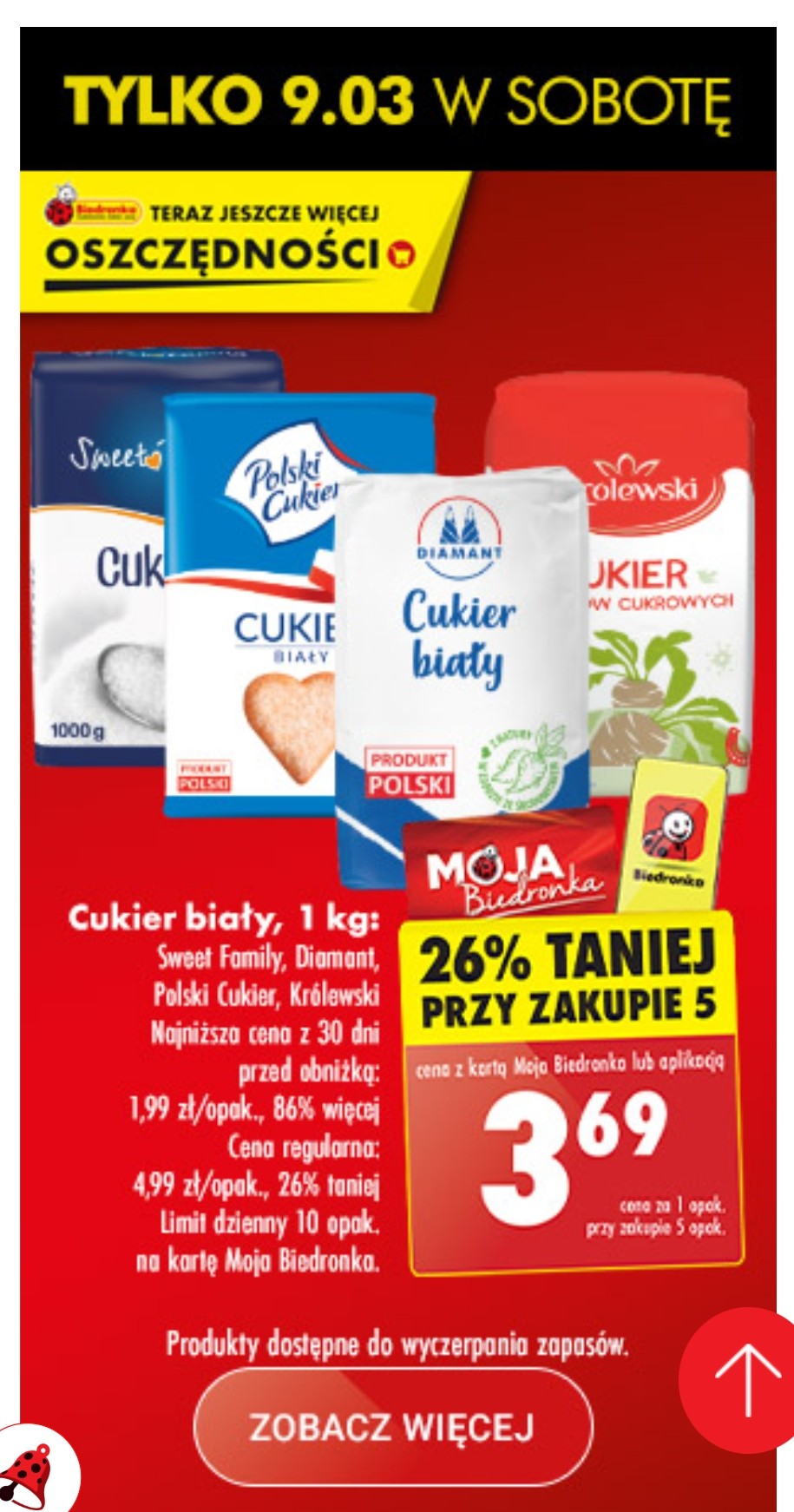 W tym dniu, klienci będą mogli skorzystać z obniżek, które sięgają nawet 26% przy zakupie pięciu opakowań cukru z oferty, która obejmuje marki takie jak Sweet Family, Diamant, Polski Cukier, czy Królewski.