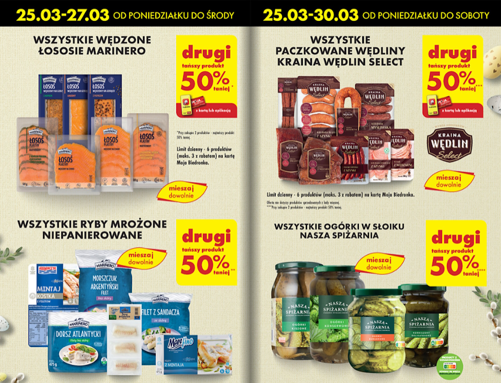 Druga fala rabatów, dostępna od poniedziałku do soboty, kusi miłośników wędlin pakowanych. Tutaj również mamy możliwość skorzystania z oferty drugi produkt 50% taniej przy zakupie dwóch sztuk z asortymentu „Kraina Wędlin Select”. Również wszystkie ogórki w słoiku od „Nasza Spiżarnia” wezmą udział w promocji 2 za 1.