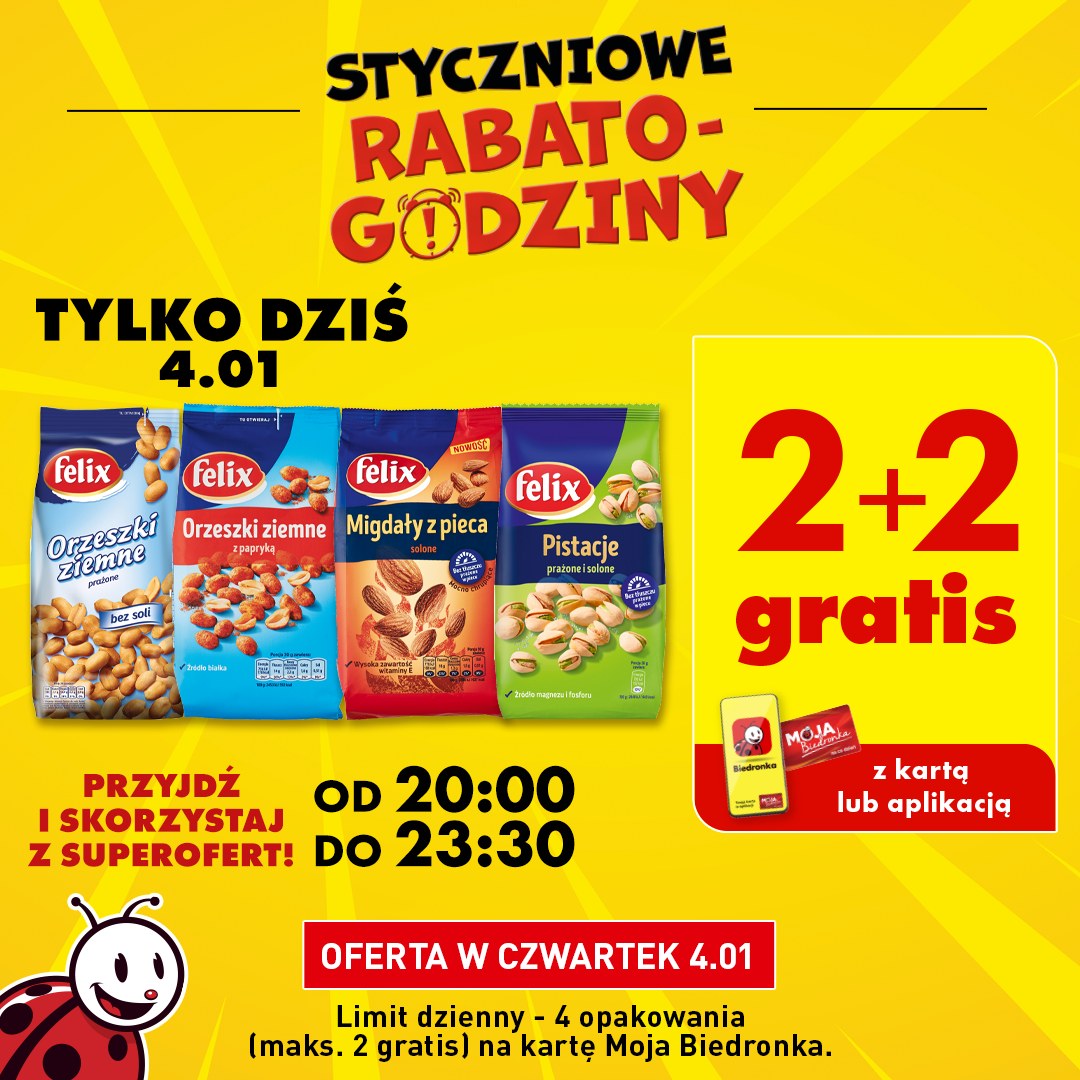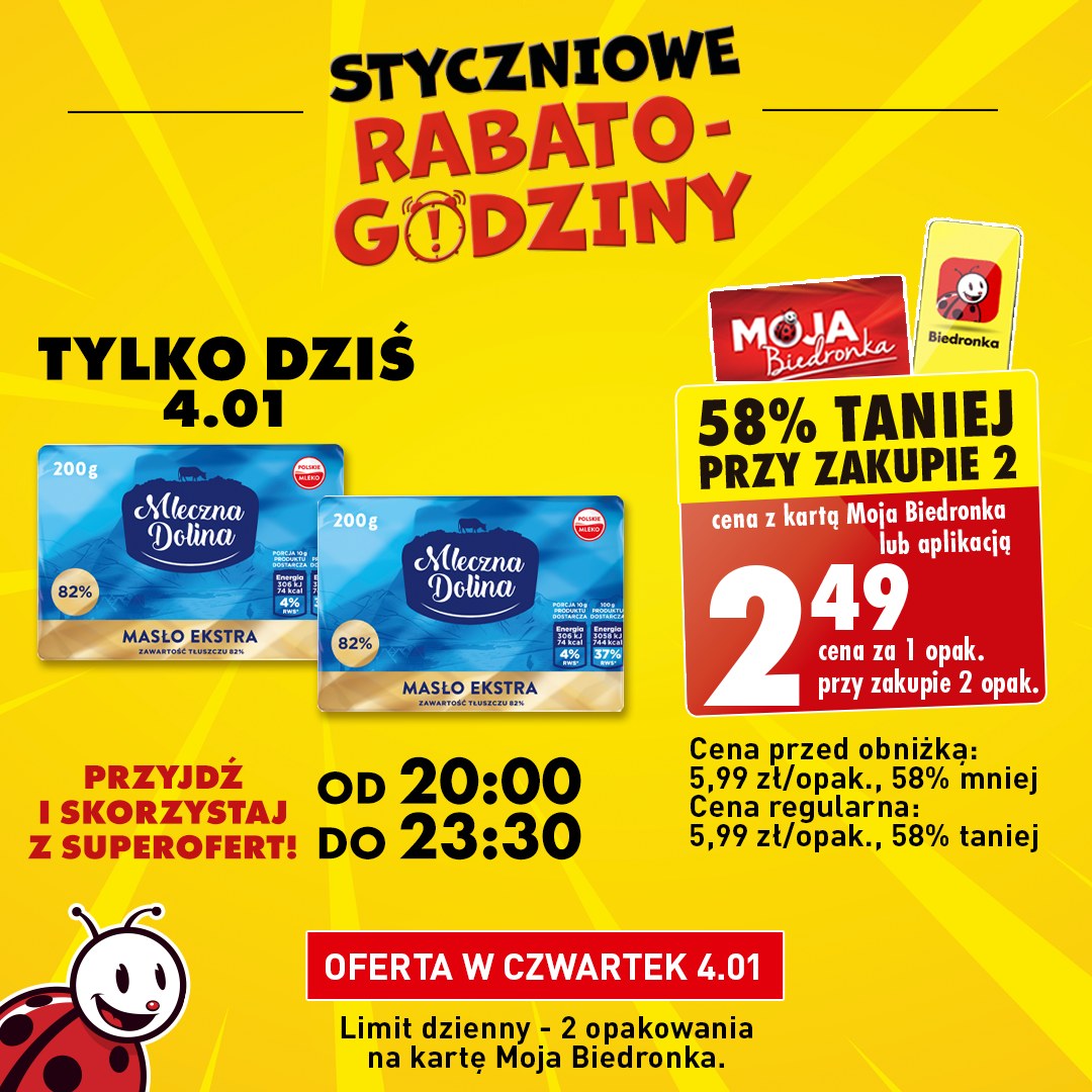 Promocja skierowana jest do posiadaczy karty Moja Biedronka lub użytkowników aplikacji i obowiązuje tylko dzisiaj, w czwartek, 4 stycznia, od 20:00 do 23:30. W ofercie znajdą się popularne produkty spożywcze oraz artykuły gospodarstwa domowego. Wyróżnione produkty to między innymi: