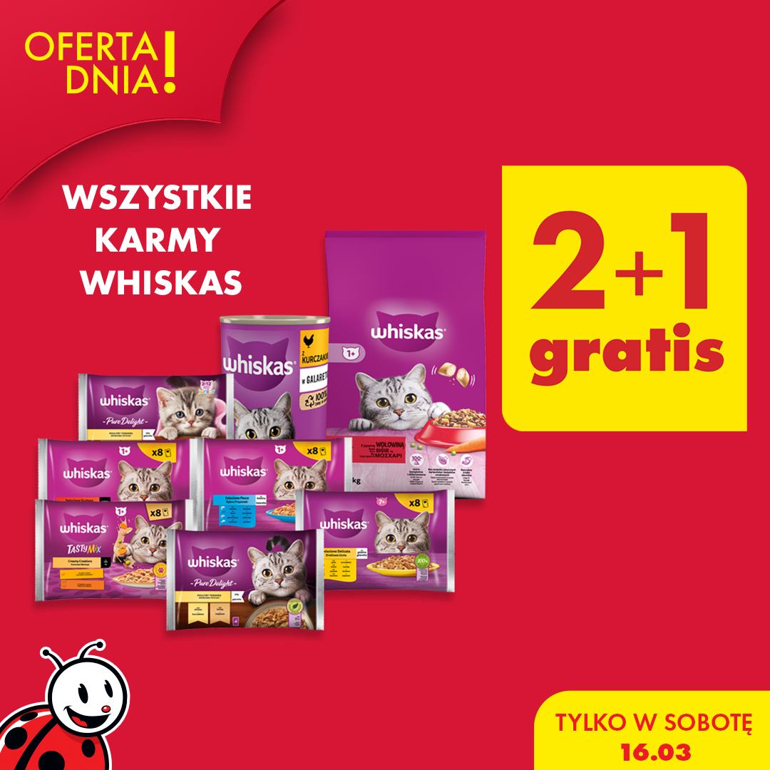 Biedronka, popularna sieć sklepów w Polsce, przygotowała atrakcyjną promocję, która z pewnością przyciągnie wielu miłośników kotów. Tylko w sobotę, 16 marca, klienci mogą skorzystać ze specjalnej oferty na wszystkie karmy marki Whiskas. W ramach promocji, przy zakupie dwóch produktów, trzeci otrzymujemy gratis!