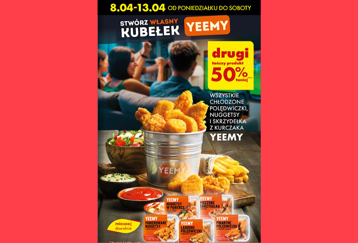 W ramach promocji, Biedronka oferuje 50% zniżki na drugi produkt z gamy chłodzonych przysmaków z kurczaka marki Yeemy, obejmujących takie produkty jak poledwiczki, nuggetsy i skrzydełka. To propozycja dla tych, którzy lubią mieć kontrolę nad tym, co jedzą i chcą sami decydować o składnikach swojego posiłku.