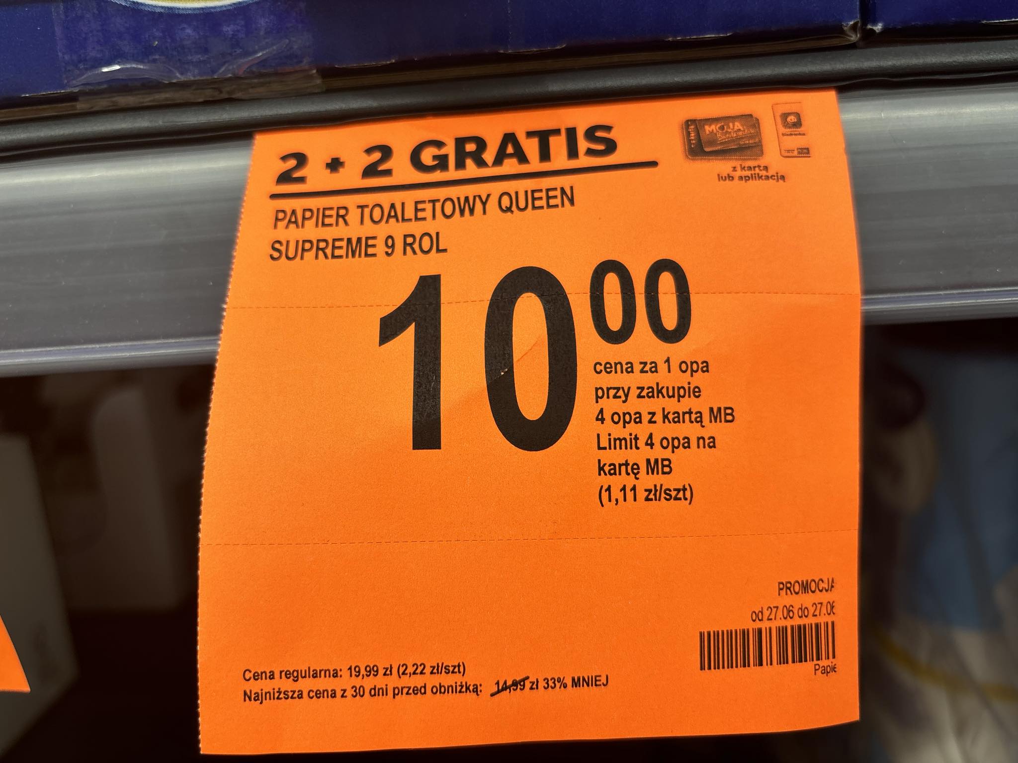 Promocja obowiązuje od 27 czerwca do 27 lipca 2024 roku i dotyczy papieru toaletowego Queen Supreme 9 rol. Aby skorzystać z oferty, należy posiadać kartę Moja Biedronka lub aplikację mobilną Biedronki. Limit zakupu wynosi cztery opakowania na kartę. Regularna cena jednego opakowania to 19,99 zł, co oznacza, że dzięki promocji cena za jedno opakowanie spada do zaledwie 10 zł.