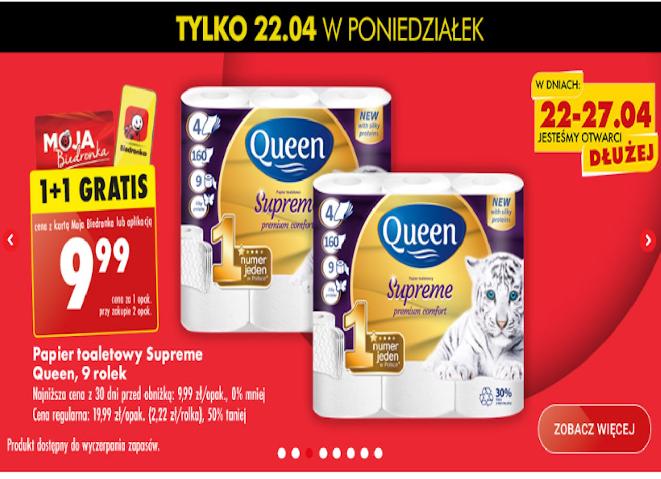 W ramach tej specjalnej oferty, Biedronka oferuje swoim klientom produkty w atrakcyjnych cenach, gdzie przy zakupie jednego produktu, drugi otrzymują bez żadnych dodatkowych kosztów. Na przykład, w promocji znajduje się papier toaletowy Supreme Queen, gdzie przy zakupie jednego opakowania zawierającego 9 rolek, drugie opakowanie dostaniemy za darmo. Co ważne, promocja dotyczy klientów posiadających kartę Moja Biedronka lub aplikację.