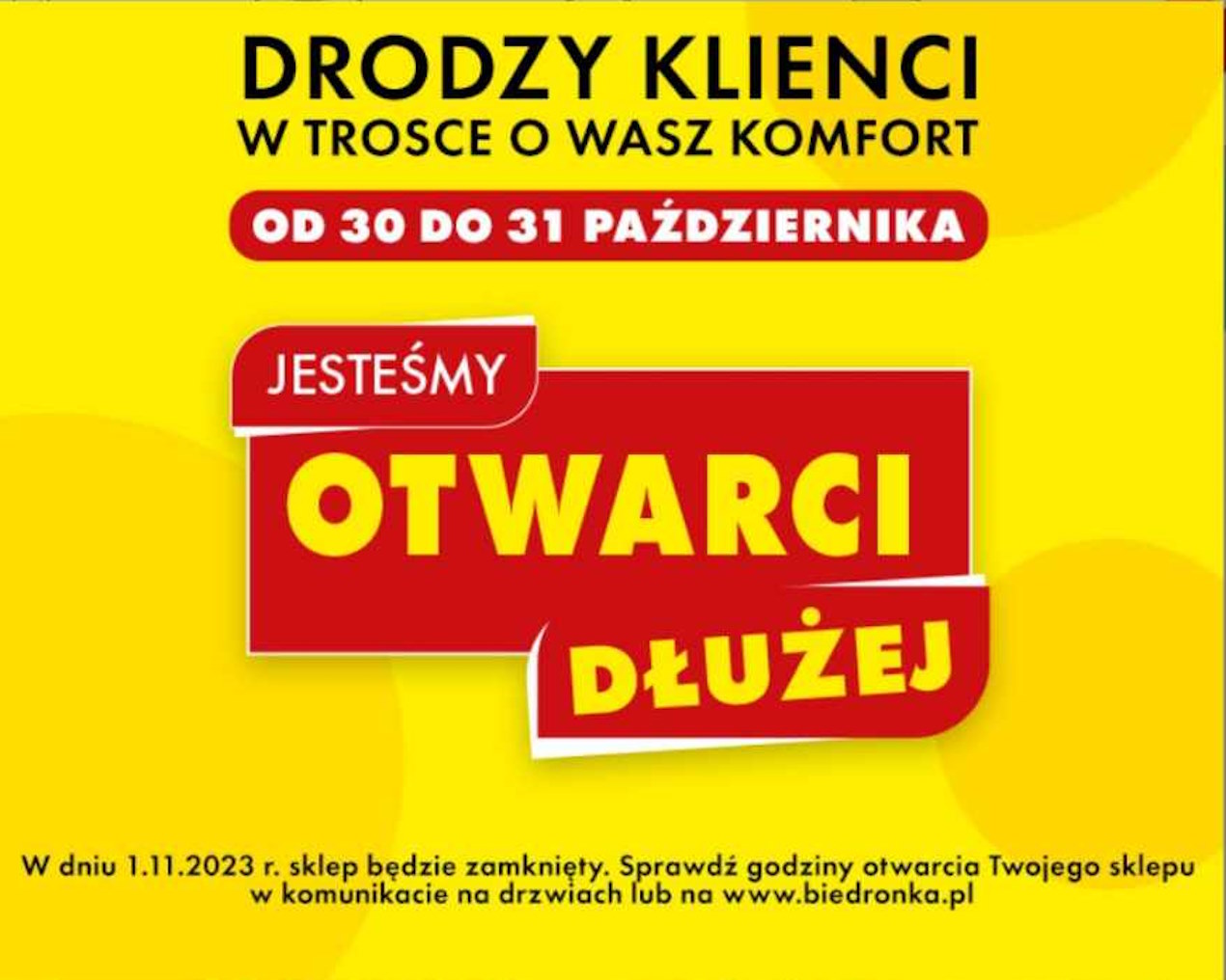 W najnowszym komunikacie, który pojawił się zarówno na stronie internetowej sieci, jak i na drzwiach poszczególnych placówek, Biedronka informuje o wydłużeniu godzin otwarcia w dniach 30 i 31 października. Dzięki temu wszyscy, którzy potrzebują więcej czasu na zakupy czy też preferują robić je późnym wieczorem, będą mieli taką możliwość.