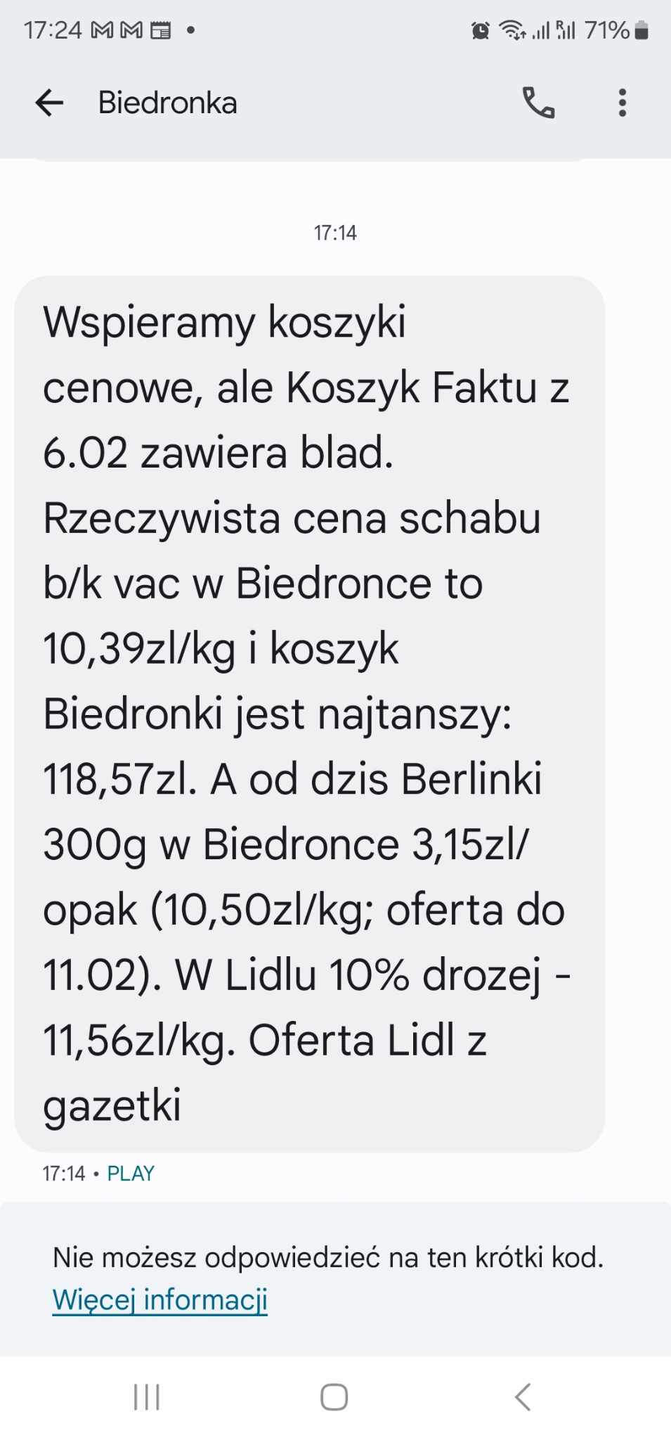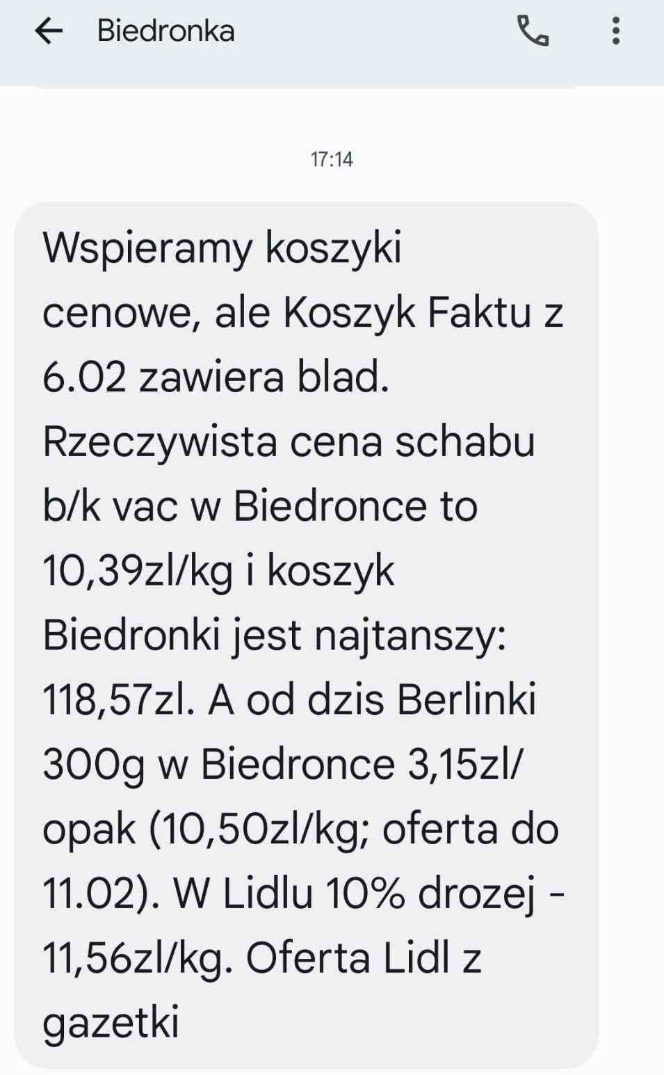 „Wspieramy koszyki cenowe, ale Koszyk Faktu z 6.02 zawiera blad. Rzeczywista cena schabu b/k vac w Biedronce to 10,39zl/kg i koszyk Biedronki jest najtanszy: 118,57zl. A od dzis Berlinki 300g w Biedronce 3,15zl/opak (10,50zl/kg; oferta do 11.02). W Lidlu 10% drozej – 11,56zl/kg. Oferta Lidl z gazetki” – czytamy w wiadomości SMS od sieci Biedronka. Klienci zauważyli już wiadomości od sieci i w komentarzach znowu zawrzało.