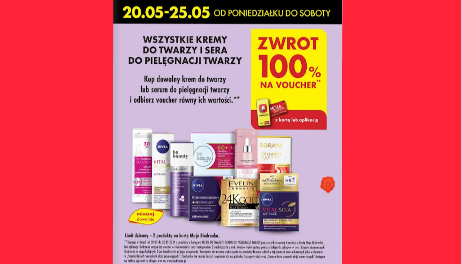 Tylko od poniedziałku, 20 maja, do soboty, 25 maja, w Biedronce trwa promocja, dzięki której możesz otrzymać 100% wartości zakupionych kremów do twarzy lub serum w formie vouchera. Takie okazje zdarzają się niezwykle rzadko, więc nie zwlekaj i już od poniedziałku odwiedź najbliższą Biedronkę. Skorzystaj z niesamowitej promocji i zadbaj o swoją skórę, nie martwiąc się o koszty!