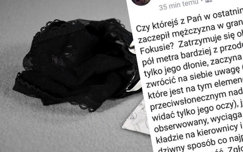 Czy którejś z Pań w ostatnim czasie nie zaczepił mężczyzna w granatowym Fordzie Fokusie? Zatrzymuje się obok na światłach, pół metra bardziej z przodu, żeby było widać tylko jego dłonie, zaczyna dodawać gazu, żeby zwrócić na siebie uwagę (obserwuje z lusterku które jest na tym elemencie przeciwsłonecznym nad głową pasażera, widać tylko jego oczy), jak już wie, że jest obserwowany, wyciąga damska bieliznę, kładzie na kierownicy i zaczyna ją dotykać w dziwny sposób co najprawdopodobniej sprawia mu przyjemność. Zgłoszone na policję.