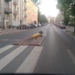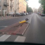 PO 30 minutach od zdarzenia Pan Krzysztof przystał nam jeszcze zdjęcia miejca. Widać na nich uszkodzoną wypepkę. Wcześniej wedle słow Pana Krzysztofa „Znak z wysepki wbił się pod samochód”. Samo auto miało uszkodzony zderzak.