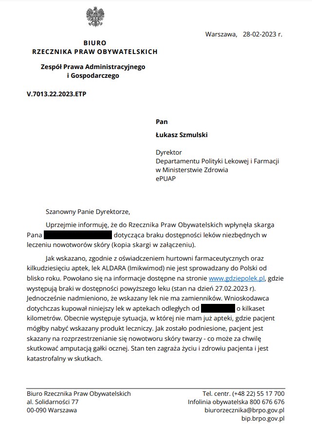 Jak wskazał obywatel, zgodnie z oświadczeniem hurtowni farmaceutycznych oraz kilkudziesięciu aptek, lek Aldara (Imikwimod) niemal od roku nie jest sprowadzany do Polski. Powołał się na informacje ze strony www.gdziepolek.pl. A specyfik ten nie ma zamienników.