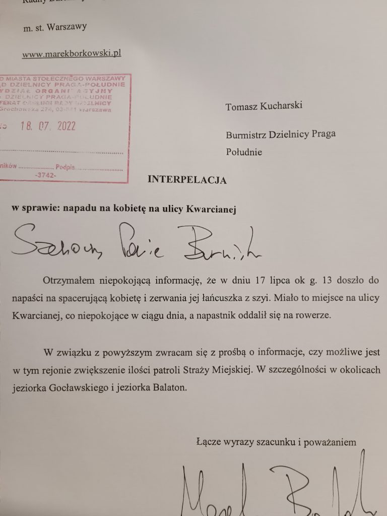 „Bezpieczeństwo naszych mieszkańców jest dla mnie absolutnie kluczowe. Z dużym niepokojem przeczytałem wczorajszy artykuł na portalu Warszawa w pigułce. Dlatego podjąłem decyzję, by złożyć interpelację w sprawie zwiększenia patroli Straży Miejskiej w okolicach jeziorka Gocławskiego i jeziorka Balaton” – mówi radny.