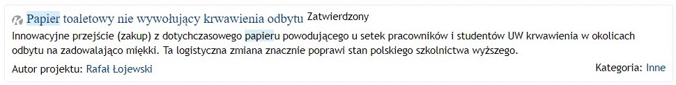 „Innowacyjne przejście (zakup) z dotychczasowego papieru powodującego u setek pracowników i studentów UW krwawienia w okolicach odbytu na zadowalająco miękki. Ta logistyczna zmiana znacznie poprawi stan polskiego szkolnictwa wyższego” – napisał Rafał Łojewski, autor projektu.