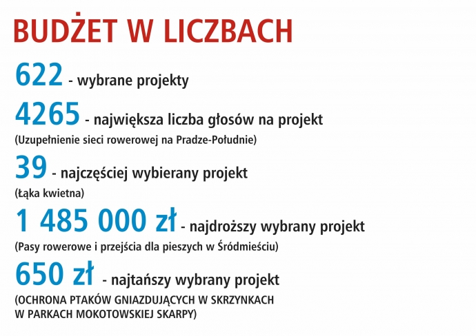 Projektem o największej liczbie zdobytych głosów był projekt „Uzupełnienie sieci rowerowej na Pradze-Południe”, który uzyskał 4265 głosów. Projektem, który powtórzył się w największej liczbie dzielnic jest „Łąka kwietna”, która realizowana będzie aż w 39 miejscach w Warszawie.