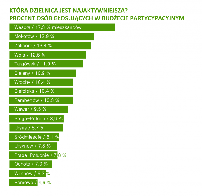Największe zainteresowanie głosowaniem odnotowano w dzielnicy Wesoła, gdzie udział w głosowaniu wzięło ponad 17% mieszkańców tej dzielnicy. Na kolejnych miejscach pod względem zainteresowania znalazły się dzielnice Mokotów (prawie 14%), Żoliborz (13,5%) oraz Wola (prawie 13%).