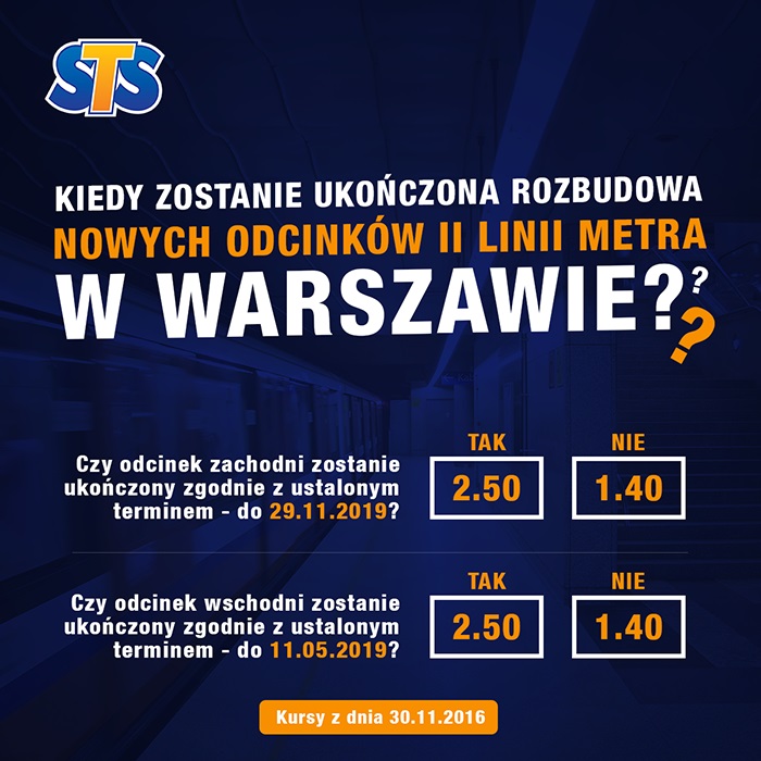 Od maja bieżącego roku trwa w Warszawie rozbudowa II linii metra o 3 stacje w kierunku wschodnim, a od kilku dni o 3 stacje w kierunku zachodnim. Prace na Pradze Północ i Targówku mają zakończyć się w maju, a na Woli w listopadzie 2019 roku. Bukmacherzy STS jednak nie wierzą w dotrzymanie tych terminów.