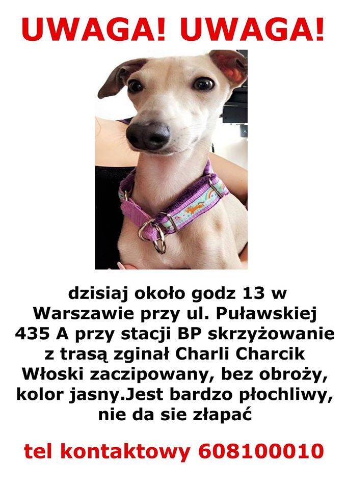 Dziś około 13stej w okolicy Puławskiej wyrwał się ze smyczy piesek , wabi się Charli jest bardzo płochliwy. Nie zna terenu. Prosimy o informacje jeśli ktoś go zauwazy – komentarz pod postem lub sms na nr tel 608100010.