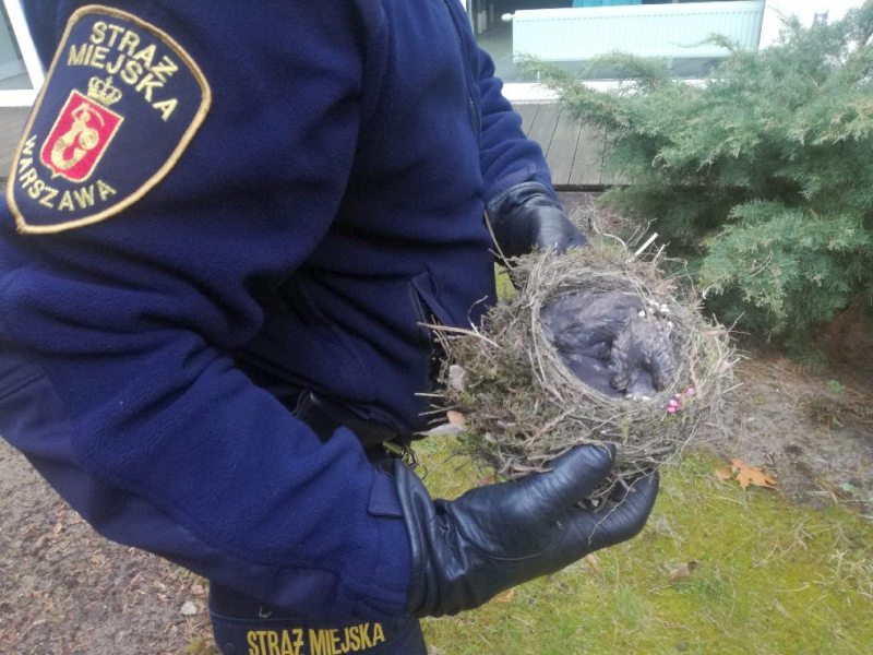 Strażnicy z Ekopatrolu otrzymali zgłoszenie od pracowników Centrum Zdrowia Dziecka o gnieździe z małymi ptakami, które znajduje się na ziemi w patio. Po przybyciu do Centrum pracownicy zaprowadzili strażników do miejsca, gdzie znajdowały się pisklęta.