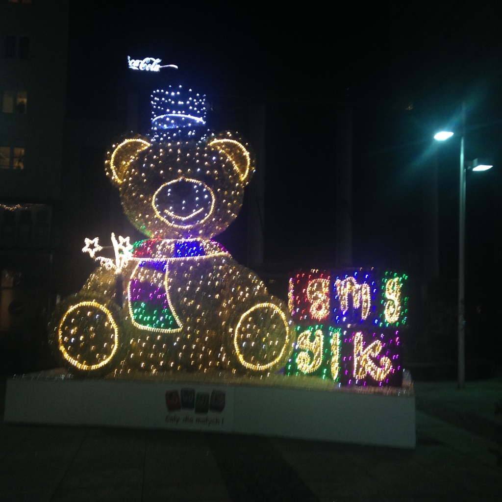 Na Chmielnej oprócz znanych już wszystkim podwieszanym do lamp gwiazdom pojawił się nietypowy Miś sklepu Smyk. Trzeba przyznać, że miś robi wrażenie 🙂 Przypomnijmy, że siedziba główna DH