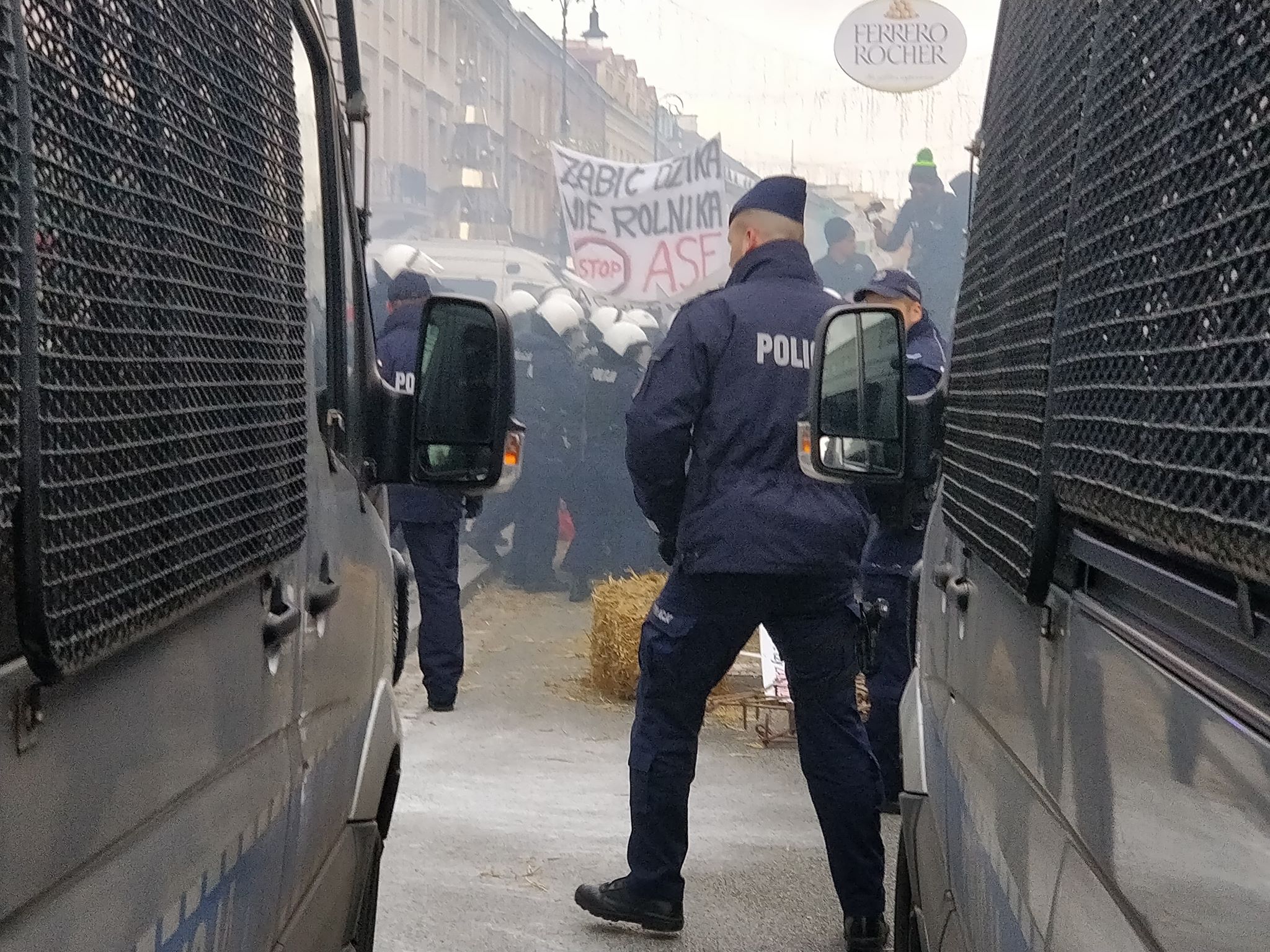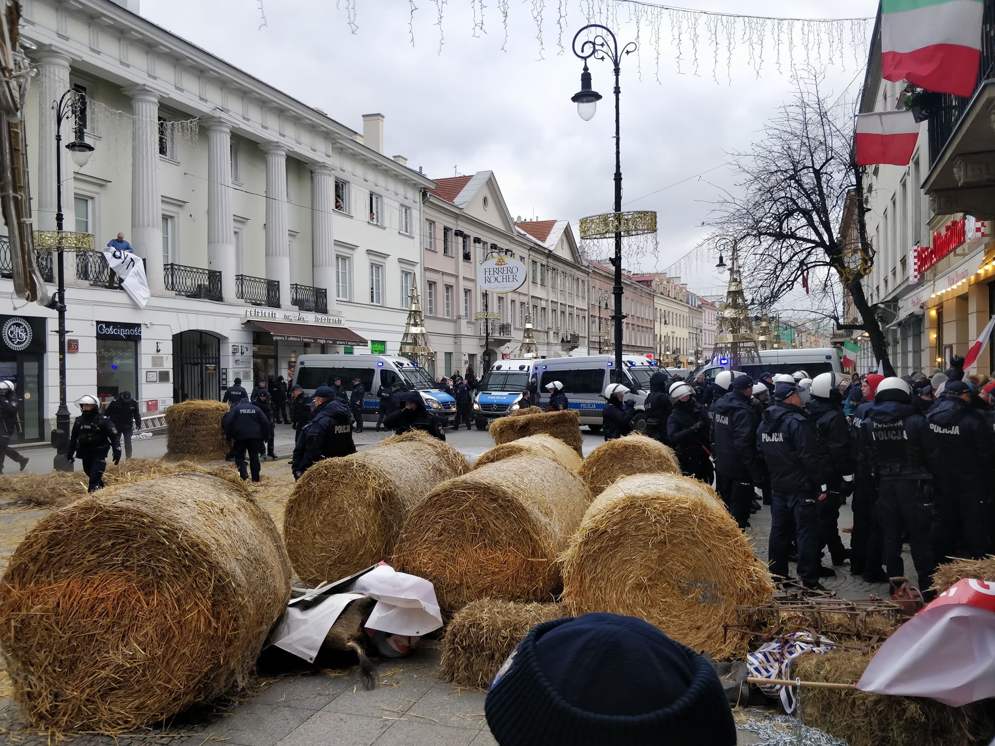 Na Nowym Świecie odbywa się aktualnie protest „Agrounii”. Przedstawiciele zablokowali ulicę stawiając bele ze słomy, niektórzy przykuli się łańcuchami. Policja stara się usunąć manifestację.
