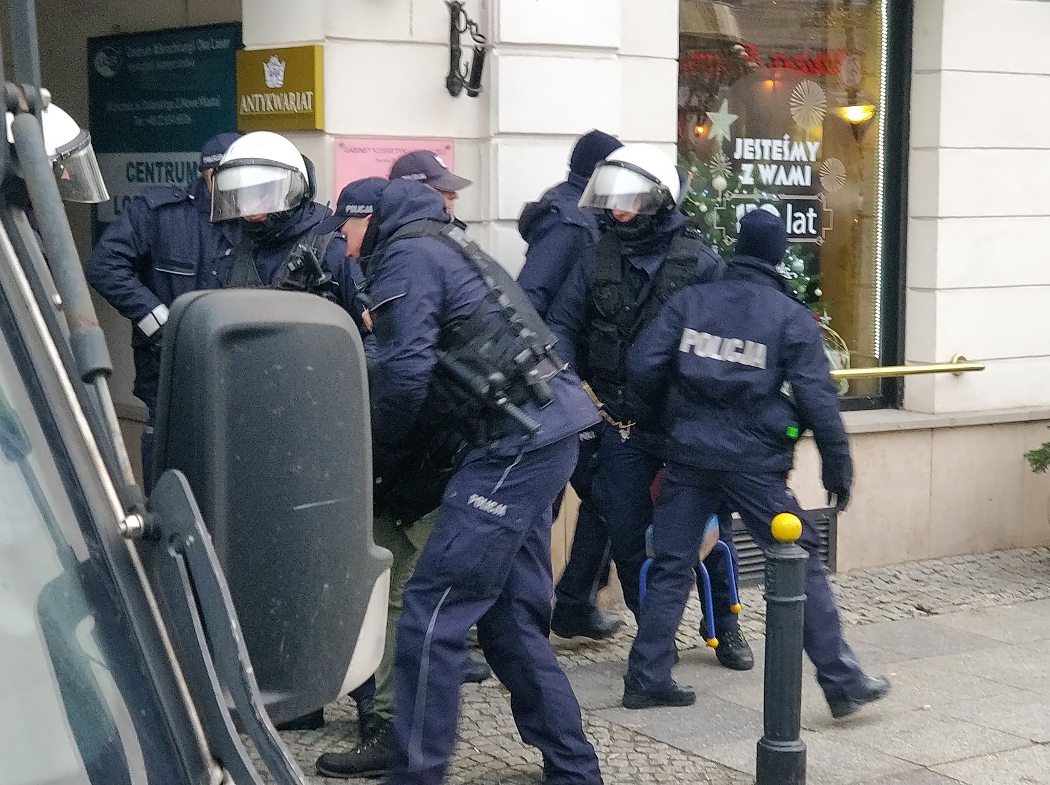 Policja przenosi manifestantów, stara się, jak najszybciej przywrócić ruch.