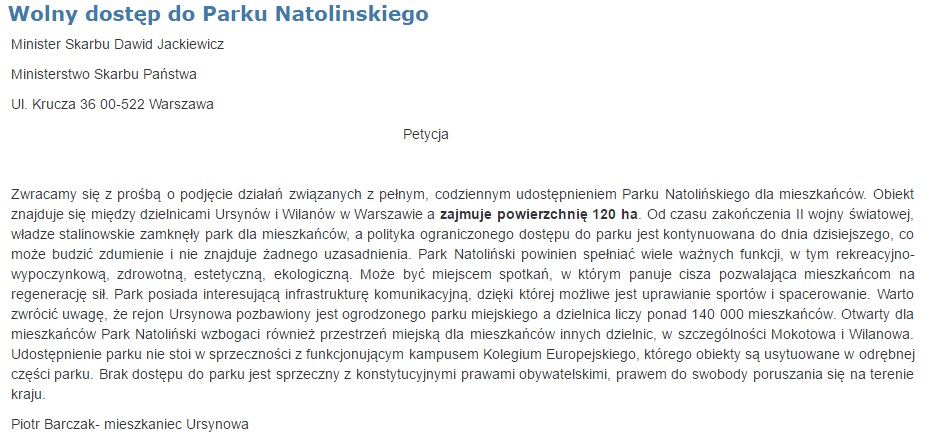 Jeden z mieszkańców Ursynowa optuje za: „pełnym, codziennym udostępnieniem Parku Natolińskiego dla mieszkańców. Od czasu zakończenia II wojny światowej, władze stalinowskie zamknęły park dla mieszkańców, a polityka ograniczonego dostępu do parku jest kontynuowana do dnia dzisiejszego”.