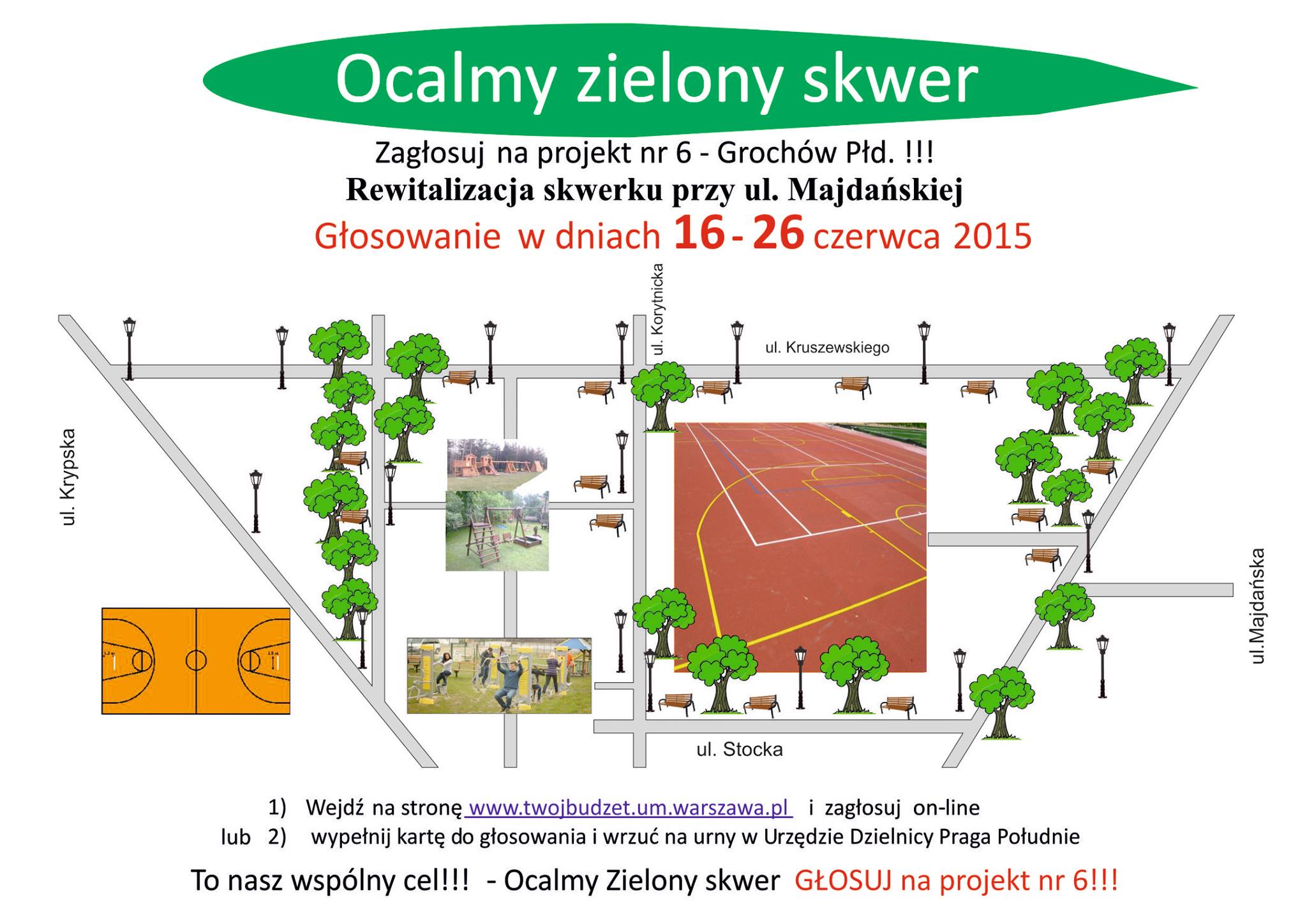 Rewitalizacja skwerku przy ul. Majdańskiej to inicjatywa mieszkańców Grochowa, którzy złożyli projekt w ramach Budżetu Partycypacyjnego na 2016 rok. Skwerek jest dość pokaźny. Często korzystają z niego okoliczni mieszkańcy, którzy ćwiczą na siłowni plenerowej czy wychodzą ze zwierzętami. Dużo jest jednak do zrobienia i aby było gdzie odpocząć, potrzebny jest Wasz głos! (projekt nr 6).