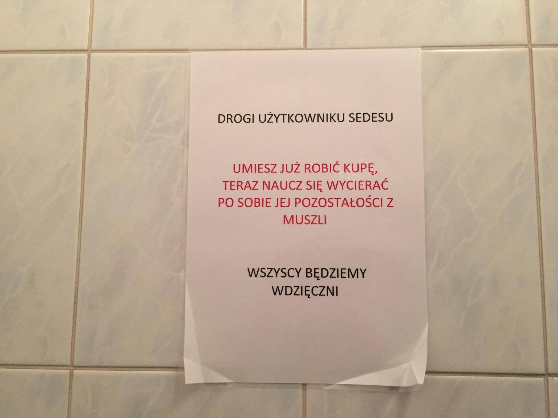 Na weekend dla rozluźnienia nastrojów ciekawostka z toalet w Welcome Airport Services na warszawskim Lotnisku Chopina. Taka oto wiadomość wita wszystkich gości chcących skorzystać z przybytku.