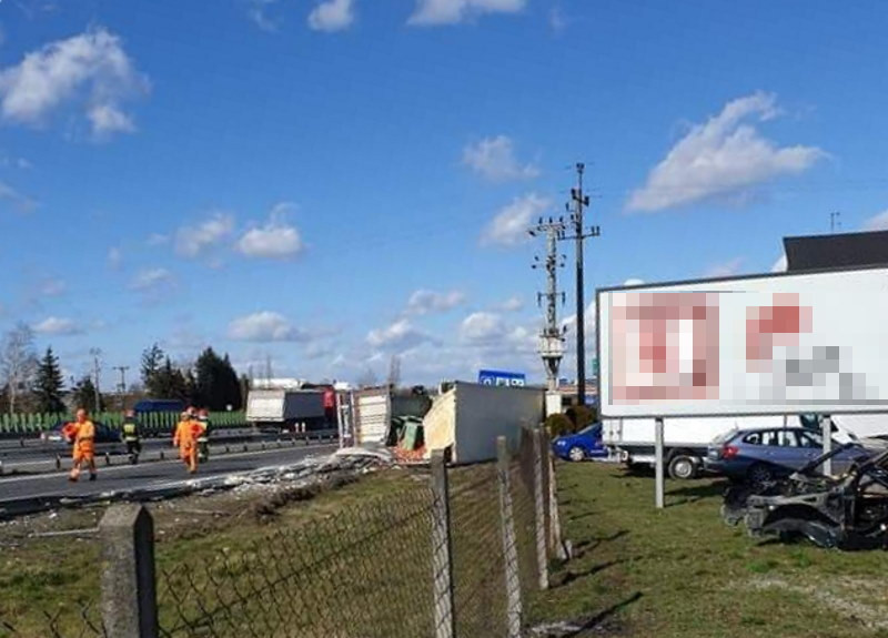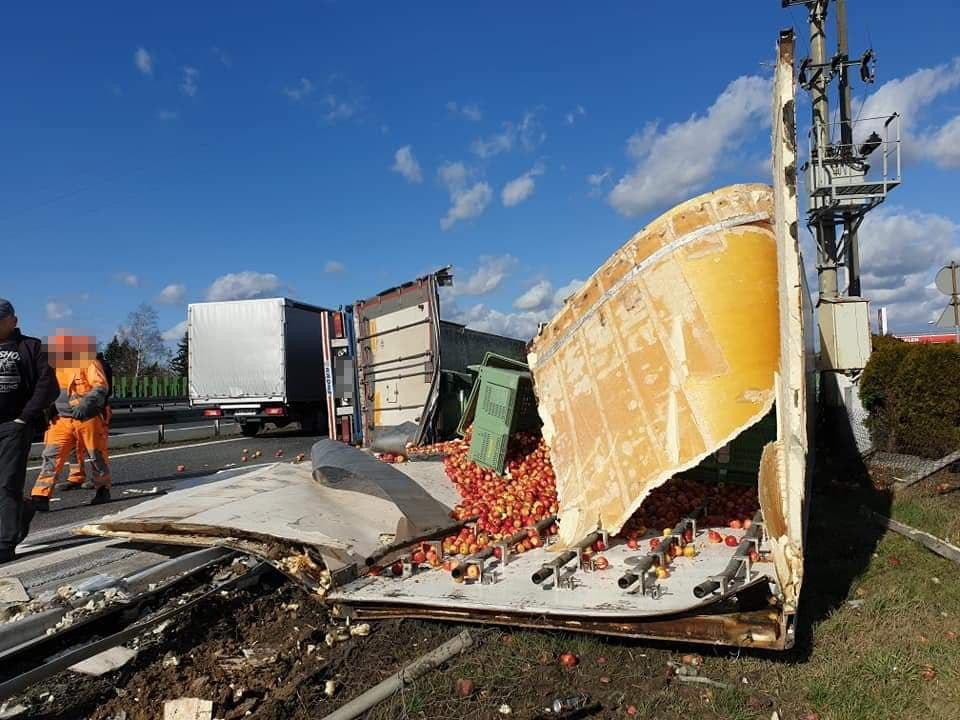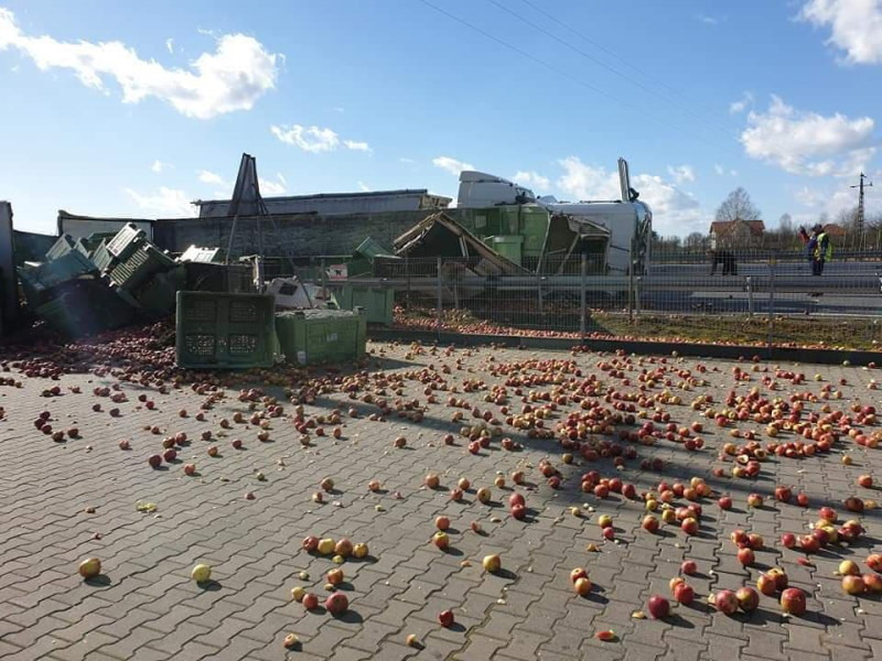 Ciężarówka z jabłkami wywróciła się na jezdnię. Zablokowana jest droga. Są duże utrudnienia.