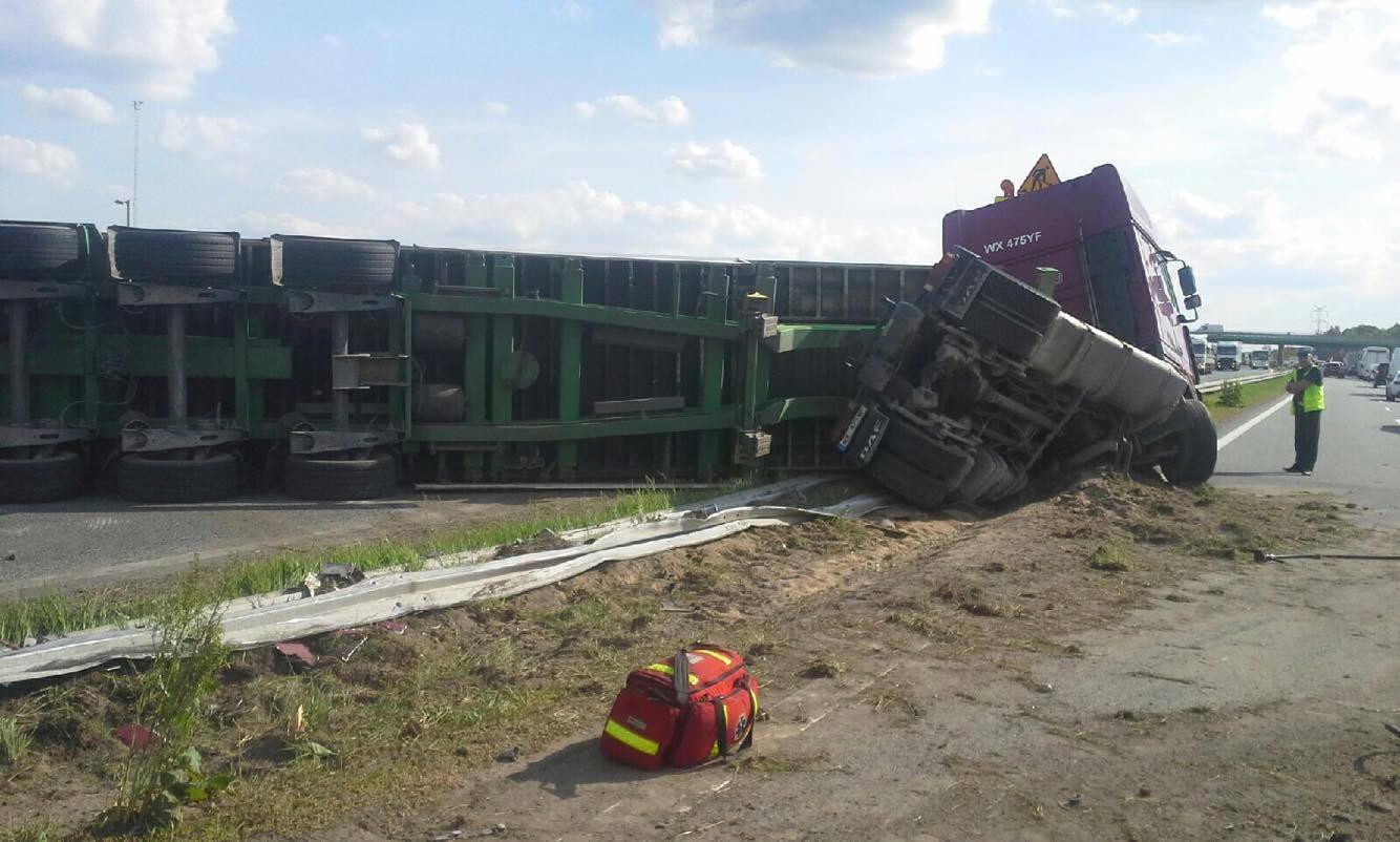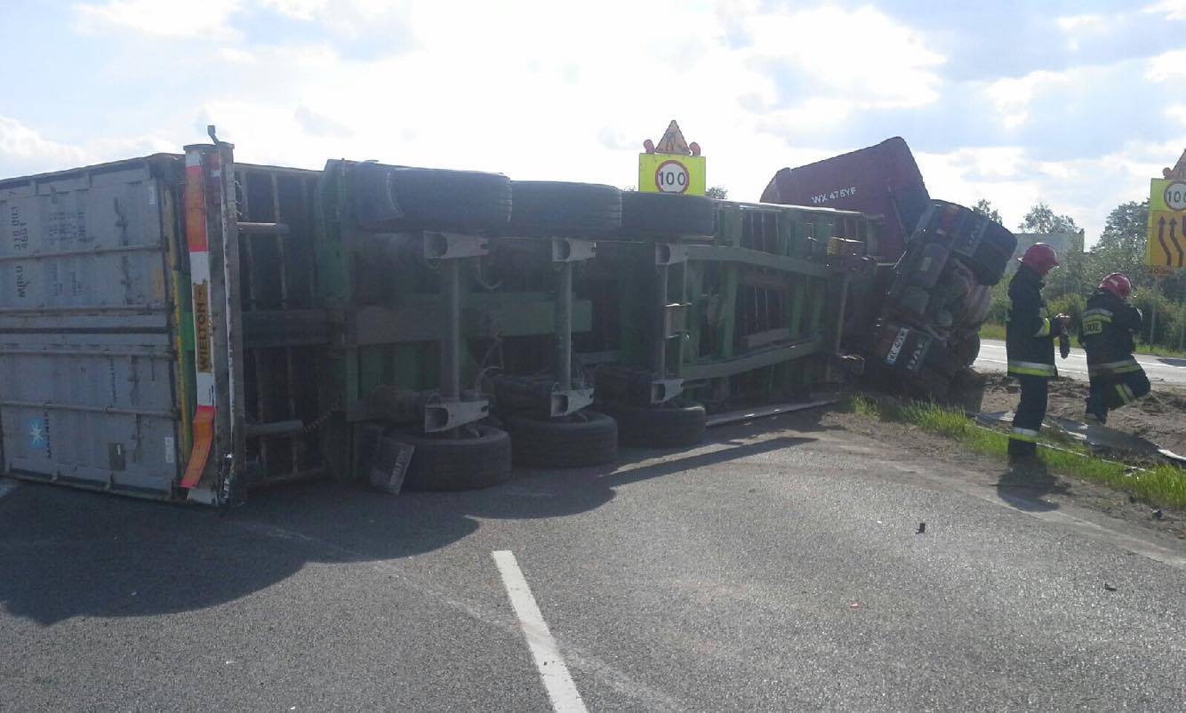 W ciężarówce jadącej w stronę Wyszkowa pękła opona. Kierowca stracił panowanie nad pojazdem i ciężarówka przewróciła się na bok. Dwa pasy w kierunku Wyszkowa i jeden pas w kierunku Warszawy są zablokowane. Policja zorganizowała objazdy. Są duże utrudnienia i tworzą się korki. Taka sytuacja potrwa jeszcze przynajmniej przez godzinę.