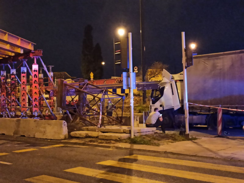 W al. Stanów Zjednoczonych na wysokości Przyczółka Grochowskiego ciężarówka wbiła się w ogranicznik wysokości przed budową nowego wiaduktu.