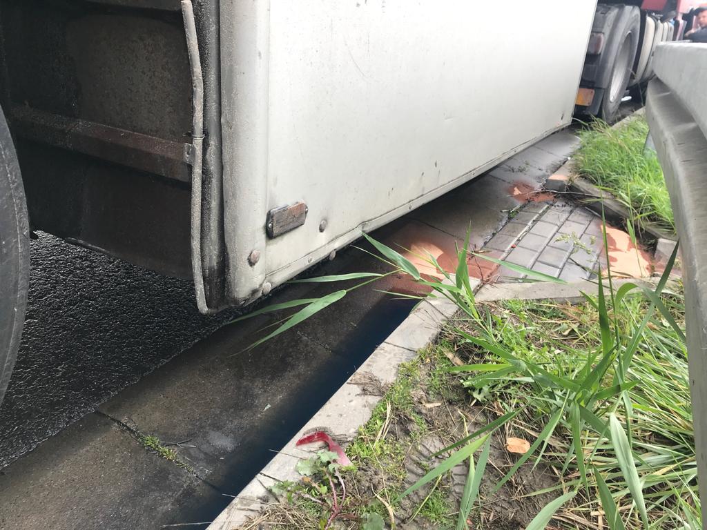 Ciężarówka wjechała w barierki. Uszkodzony zbiornik. Duży wyciek paliwa