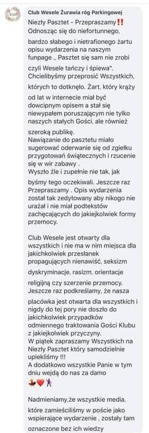 Po wczorajszej burzy w mediach, jaką wywołał opis wydarzenia w warszawskim klubie Wesele (https://warszawawpigulce.pl/seksistowska-impreza-w-warszawskim-klubie-jak-zrobic-pasztet-zajeczy/) postanowił on napisać oświadczenie na temat motywów żartu, który uwłaczał kobietom.