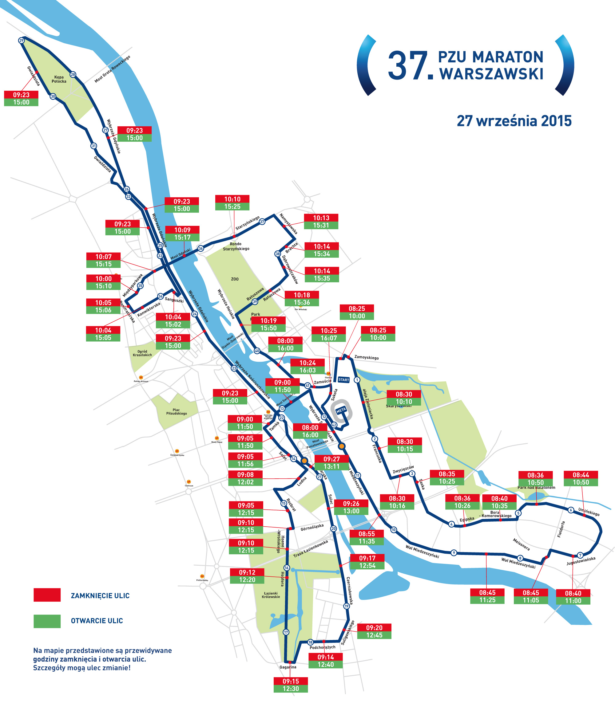 Nowa trasa 37. PZU Maratonu Warszawskiego to między innymi Praga Północ i Saska Kępa. Zawodnicy przebiegną również przez bramy Cytadeli, która na co dzień jest zamkniętym terenem wojskowym. Trasa prowadzi także przez miejsca znane z poprzednich edycji imprezy tj. Łazienki Królewskie czy legendarny tunel. Trasa Maratonu 2015 jest także bardzo „zielona”. Biegacze miną po drodze sześć warszawskich parków: Skaryszewski, Nad Balatonem, Agrykolę, Łazienki Królewskie, Kępę Potocką i Park Praski.