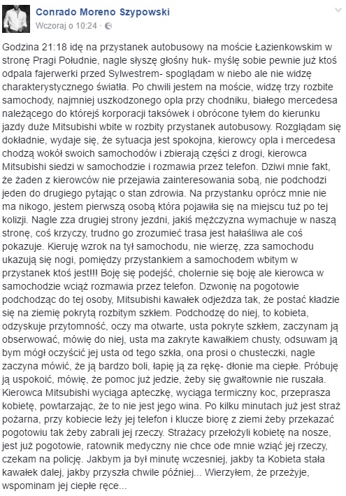 „Godzina 21:18 idę na przystanek autobusowy na moście Łazienkowskim w stronę Pragi Południe, nagle słyszę głośny huk- myślę sobie pewnie już ktoś odpala fajerwerki przed Sylwestrem- spoglądam w niebo ale nie widzę charakterystycznego światła. Po chwili jestem na moście, widzę trzy rozbite samochody, najmniej uszkodzonego opla przy chodniku, białego mercedesa należącego do którejś korporacji taksówek i obrócone tyłem do kierunku jazdy duże Mitsubishi wbite w rozbity przystanek autobusowy. Rozglądam się dokładnie, wydaje się, że sytuacja jest spokojna, kierowcy opla i mercedesa chodzą wokół swoich samochodów i zbierają części z drogi, kierowca Mitsubishi siedzi w samochodzie i rozmawia przez telefon. Dziwi mnie fakt, że żaden z kierowców nie przejawia zainteresowania sobą, nie podchodzi jeden do drugiego pytając o stan zdrowia. Na przystanku oprócz mnie nie ma nikogo, jestem pierwszą osobą która pojawiła się na miejscu tuż po tej kolizji. Nagle zza drugiej strony jezdni, jakiś mężczyzna wymachuje w naszą stronę, coś krzyczy, trudno go zrozumieć trasa jest hałaśliwa ale coś pokazuje. Kieruję wzrok na tył samochodu, nie wierzę, zza samochodu ukazują się nogi, pomiędzy przystankiem a samochodem wbitym w przystanek ktoś jest!!! Boję się podejść, cholernie się boję ale kierowca w samochodzie wciąż rozmawia przez telefon. Dzwonię na pogotowie podchodząc do tej osoby, Mitsubishi kawałek odjeżdza tak, że postać kładzie się na ziemię pokrytą rozbitym szkłem. Podchodzę do niej, to kobieta, odzyskuje przytomność, oczy ma otwarte, usta pokryte szkłem, zaczynam ją obserwować, mówię do niej, usta ma zakryte kawałkiem chusty, odsuwam ją bym mógł oczyścić jej usta od tego szkła, ona prosi o chusteczki, nagle zaczyna mówić, że ją bardzo boli, łapię ją za rękę- dłonie ma ciepłe. Próbuję ją uspokoić, mówię, że pomoc już jedzie, żeby się gwałtownie nie ruszała. Kierowca Mitsubishi wyciąga apteczkę, wyciąga termiczny koc, przeprasza kobietę, powtarzając, że to nie jest jego wina. Po kilku minutach już jest straż pożarna, przy kobiecie leży jej telefon i klucze biorę z ziemi żeby przekazać pogotowiu tak żeby zabrali jej rzeczy. Strażacy przełożyli kobietę na nosze, jest już pogotowie, ratownik medyczny nie chce ode mnie wziąć jej rzeczy, czekam na policję. Jakbym ja był minutę wczesniej, jakby ta Kobieta stała kawałek dalej, jakby przyszła chwile później… Wierzyłem, że przeżyje, wspominam jej ciepłe ręce…”