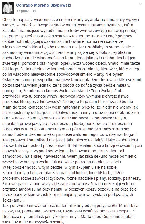 „Chcę to napisać- wiadomość o śmierci Marty wywarła na mnie duży wpływ i wierzę, że odciśnie swoje piętno w moim życiu. Opisałem sytuację, którą zastałem na miejscu wypadku nie po to by zwrócić uwagę na swoją osobę, nie po to by ktoś mi za coś dziękował- telefon po karetkę i chęć pomocy osobie potrzebującej uważam za zachowanie normalne i sądzę, że większość osób która byłaby na moim miejscu zrobiłaby to samo. Jestem zasmucony wiadomością o śmierci Marty, łączę się w bólu z Jej bliskimi, dochodzą do mnie wiadomości na temat tego jaką była osobą- kochająca zwierzęta, pomocna dla innych, opiekuńcza wobec dzieci. Smuci mnie także fakt tego, że tak chętnie w komentarzach oczernia się kierowcę, który z tego co mi wiadomo nieświadomie spowodował śmierć Marty. Nie byłem świadkem samego wypadku, na przystanek dotarłem dosłownie kilka sekund po zdarzeniu.Wiem jednak, że ta osoba do końca życia będzie miała w pamięci to, że odebrała komuś życie. Nic Marcie Tego życia już nie przywróci. Kto tu ponosi winę? Kierowca który wymusił pierwszeństwo, prędkość któregoś z kierowców? Nie będę tego sam tu roztrząsał bo nie mam do tego kompetencji- wiem natomiast tylko to, że nigdy nie wiemy jak blisko jesteśmy od tragedii, jak łatwo można innym oraz sobie odebrać życie oraz zdrowie. Sam byłem wielokrotnie kierowcą nieodpowiedzialnym, straciłem prawo jazdy za przekroczoną liczbę punktów, za prekroczenie prędkości w terenie zabudowanym od pół roku nie przemieszczam się samochodem. Jestem większym obserwatorem tego, co widzę na drogach jako pasażer komunikacji miejskiej, jako pieszy ale także i jako osoba która prowadziła samochód przez ponad 18 lat. Miałem sporo kolizji w swoim życiu i poważniejszych wypadków, w tym i dachowanie po utracie kontroli samochodu na śliskiej nawierzchni. Wiem jak kilka sekund może odmienić wszystko w naszym życiu. Jak nie wiele potrzeba do nieszczęścia.