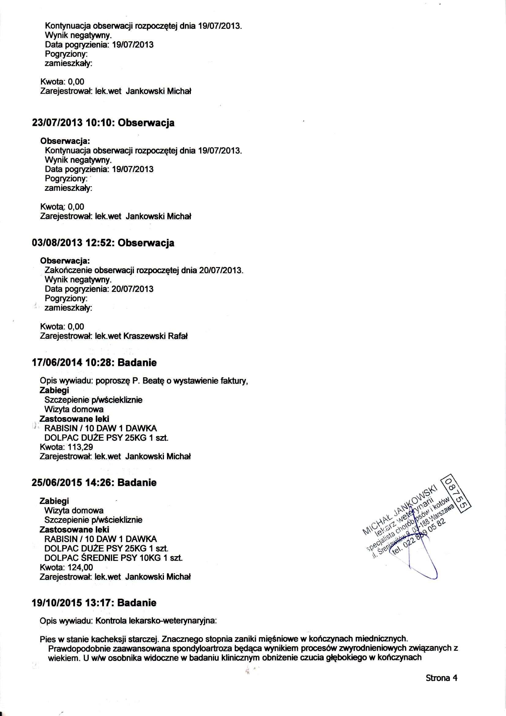 Przesłane nam skany to tak naprawdę pełna dokumentacja medyczna. Znajdziemy w niej nie tylko diagnozę, ale także zaświadczenie i opinię weterynarza oraz daty i cel każdej z wizyt.