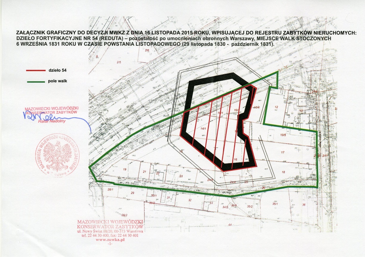 Dzieło fortyfikacyjne nr 54 (reduta) – pozostałość po umocnieniach obronnych Warszawy, miejsce walk stoczonych 6 września 1831 roku w czasie Powstania Listopadowego (29 listopada 1830 – październik 1831) została wpisana do rejestru zabytków z uwagi na zachowane wartości historyczne i naukowe.