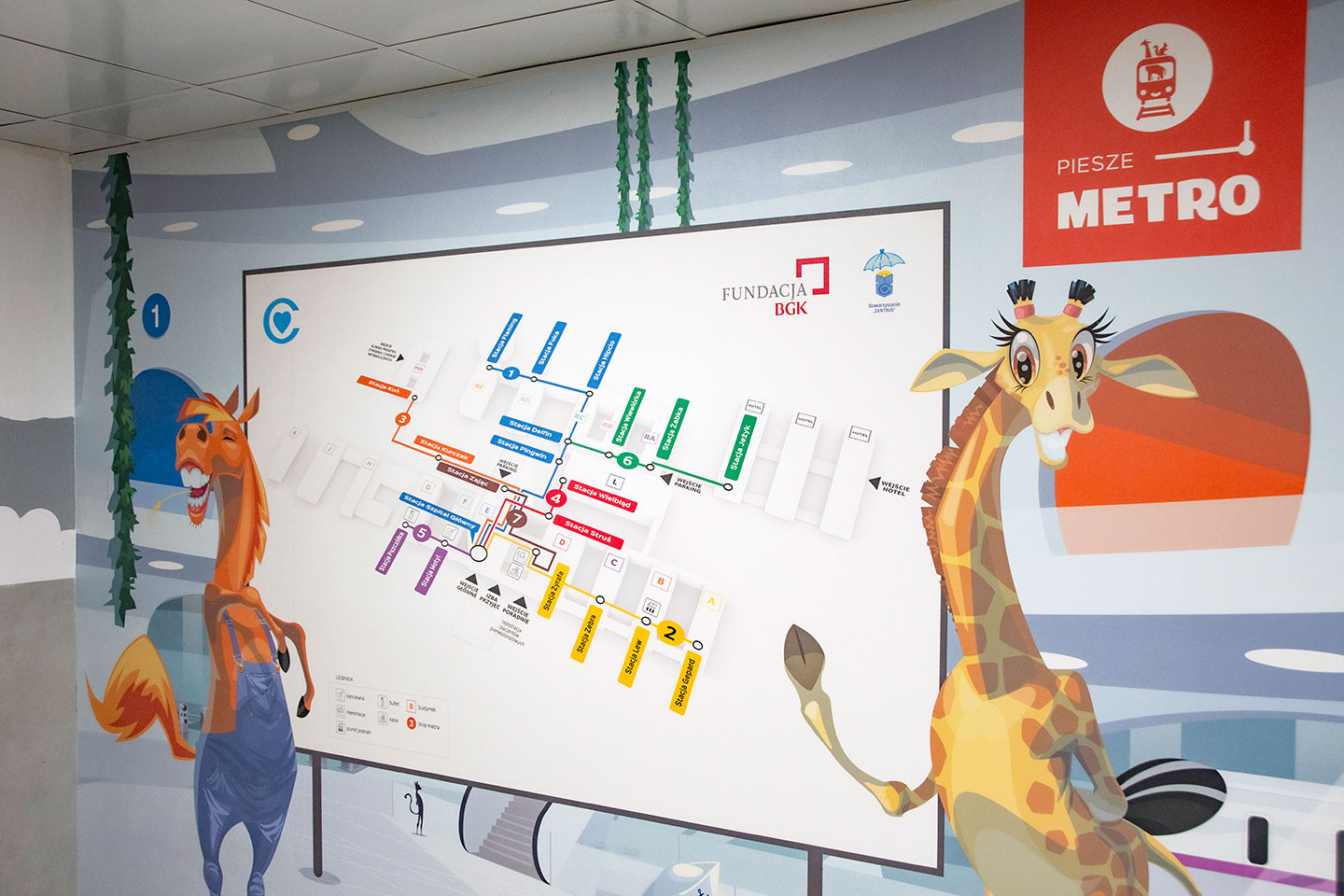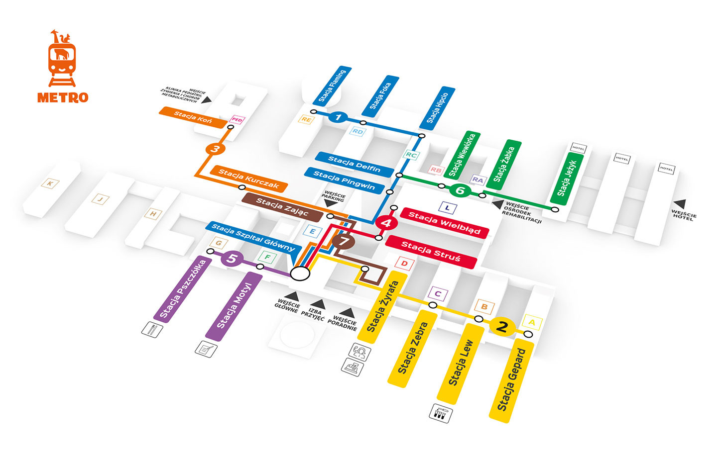 zdecydowanie ułatwią skuteczne i szybkie dotarcie do właściwego miejsca w CZD. Bazując na przejrzystej koncepcji mapy metra, stworzono 7 linii łączących budynki Instytutu. Każda z nich została oznaczona swoim własnym kolorem, motywem i podzielona na stacje. Zastosowane grafiki, pełne kolorów i humoru, pozwalają nie tylko na szybkie dotarcie do celu, ale rozśmieszając i angażując do zabawy redukują stres małych pacjentów i ich opiekunów.
