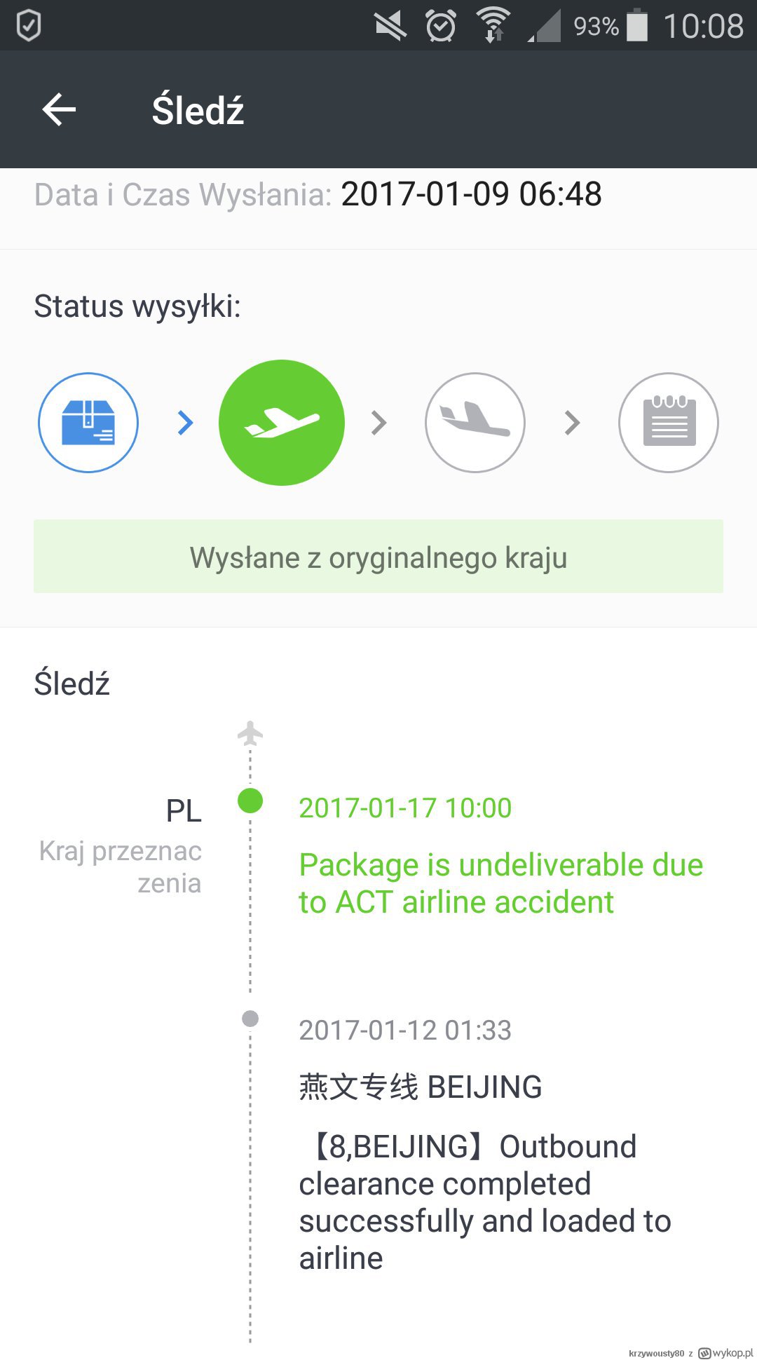 Użytkownik Wykopu krzywousty80, podał, że samolot miał dostarczyć paczki z Aliexpress do Europy w tym do Polski i na dowód umieścił zrzut ekranu z zamówienia.