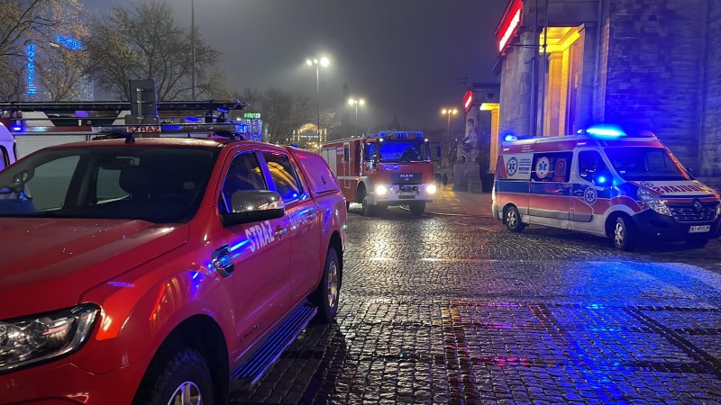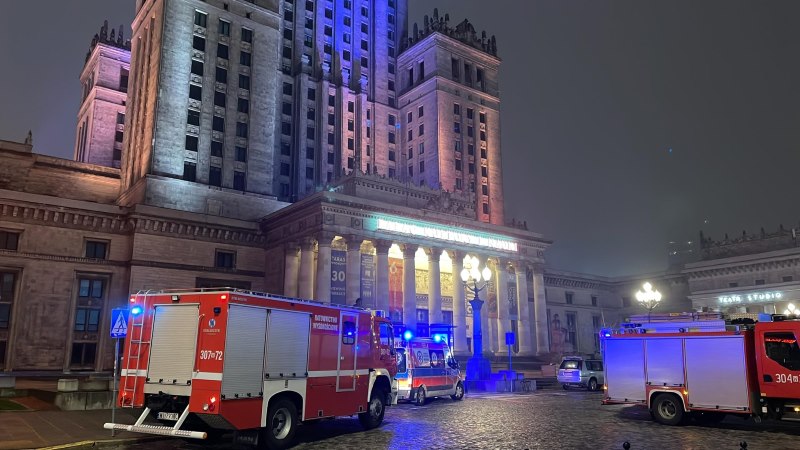 Człowiek za barierami tarasu Pałacu Kultury. Na miejscu wszystkie służby