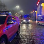 Trwa akcja służb. Próbują namówić mężczyznę do zejścia i zabezpieczają miejsce zdarzenia.