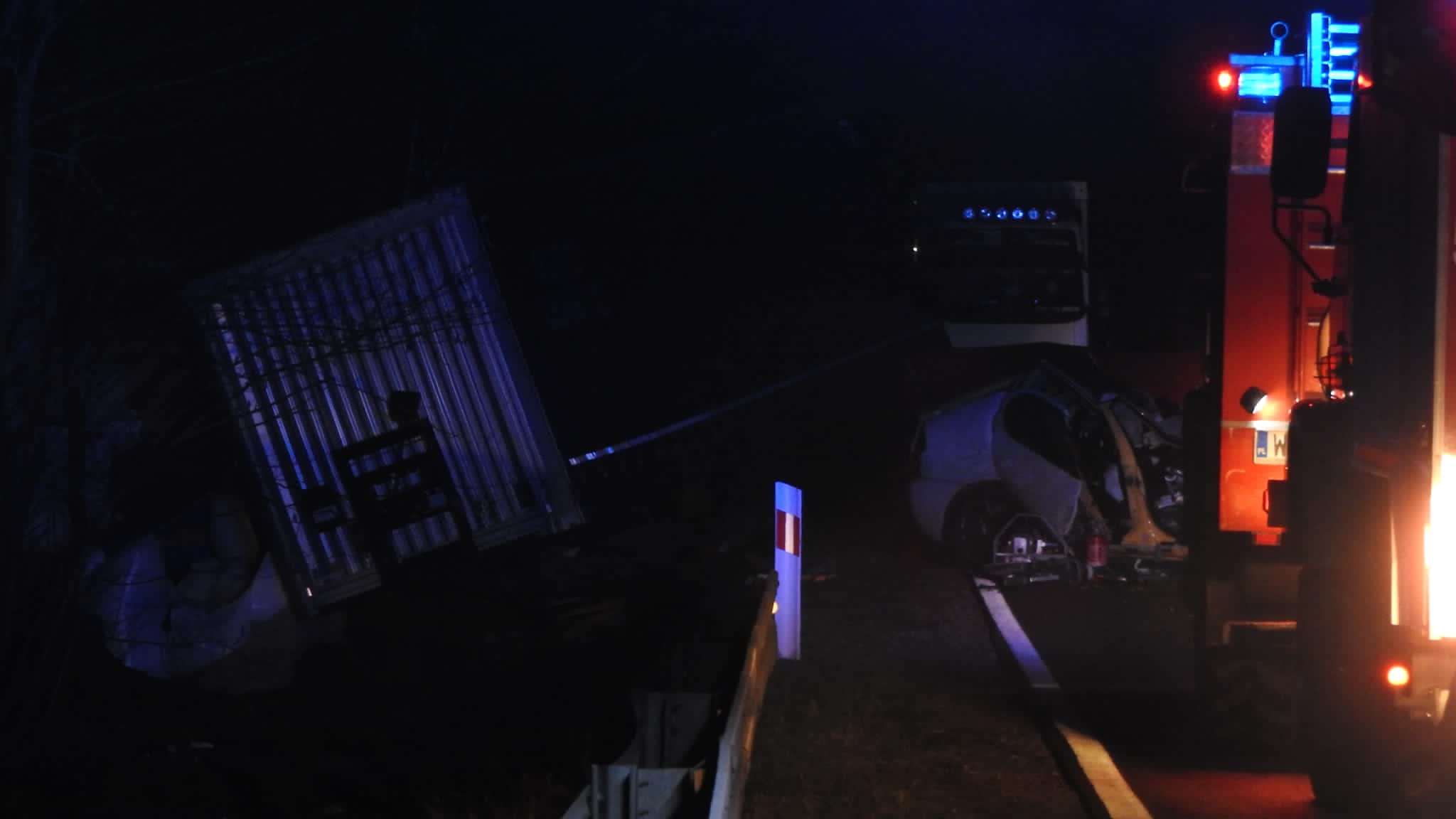 Czołowe zderzenie ciężarówki z osobówką pod Warszawą. Jedna osoba nie żyje