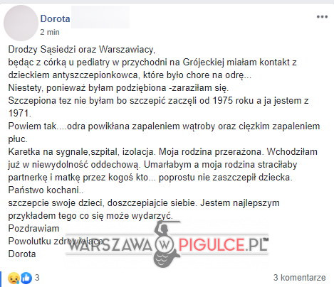 „Drodzy Sąsiedzi oraz Warszawiacy, będąc z córką u pediatry w przychodni na Grójeckiej miałam kontakt z dzieckiem antyszczepionkowca, które było chore na odrę…” – pisze Pani Dorota na naszej grupie. Warszawa. Mieszkańcy Warszawy i okolic.