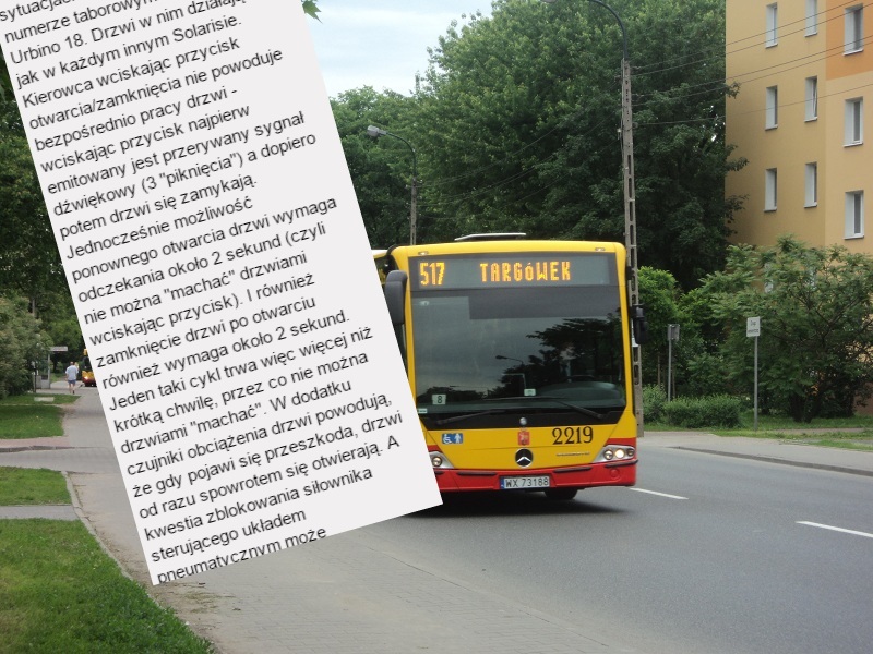 „Przykro się robi, jak ludzie usilnie szukają cudzej winy w takich sytuacjach. Wspomniany autobus o numerze taborowym **** to Solaris Urbino 18. Drzwi w nim działają tak jak w każdym innym Solarisie. Kierowca wciskając przycisk otwarcia/zamknięcia nie powoduje bezpośrednio pracy drzwi – wciskając przycisk najpierw emitowany jest przerywany sygnał dźwiękowy (3 „piknięcia”) a dopiero potem drzwi się zamykają. Jednocześnie możliwość ponownego otwarcia drzwi wymaga odczekania około 2 sekund (czyli nie można „machać” drzwiami wciskając przycisk). I również zamknięcie drzwi po otwarciu również wymaga około 2 sekund. Jeden taki cykl trwa więc więcej niż krótką chwilę, przez co nie można drzwiami „machać”. W dodatku czujniki obciążenia drzwi powodują, że gdy pojawi się przeszkoda, drzwi od razu z powrotem się otwierają. A kwestia zblokowania siłownika sterującego układem pneumatycznym może spowodować, że drzwi będą próbowały się otwierać i zamykać samoczynnie. Więc możliwe są tylko dwie takie sytuacje. Kierowcy MZA są również świadomi konsekwencji takiego zachowania i wiedzą, że nie jest to dla nich opłacalne. Dlatego po przeczytaniu tego zgłoszenia pojawiło się zażenowanie na mojej twarzy. Nie jestem rasistą, żeby bronić kierowcy, ale znam temat od podszewki i nie jest normalnym oskarżanie ludzi na takiej bezzasadnej podstawie.”