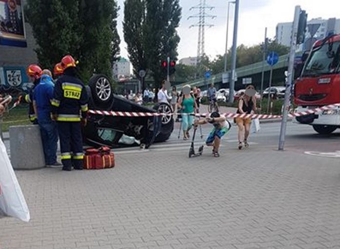 Dachowanie po zderzeniu dwóch mercedesów na Mokotowie. Ogromne utrudnienia