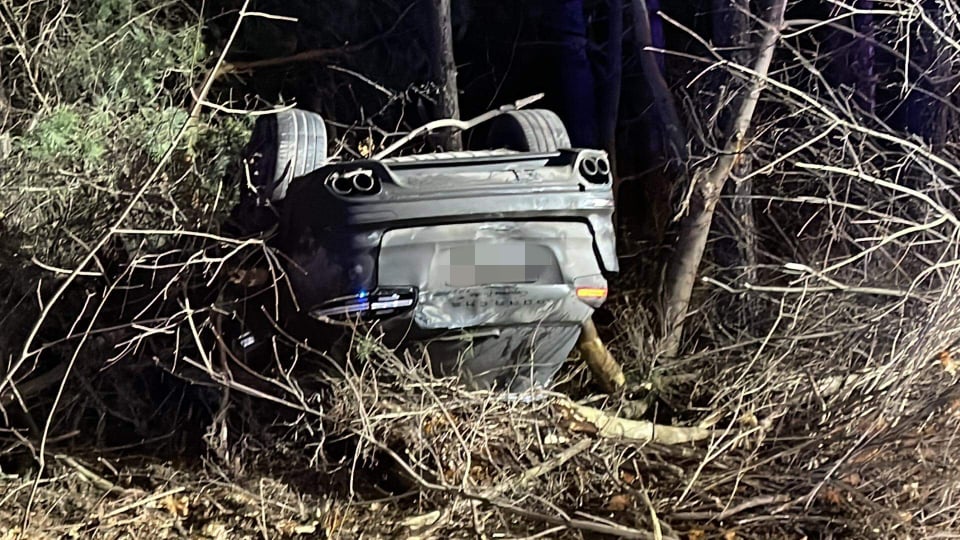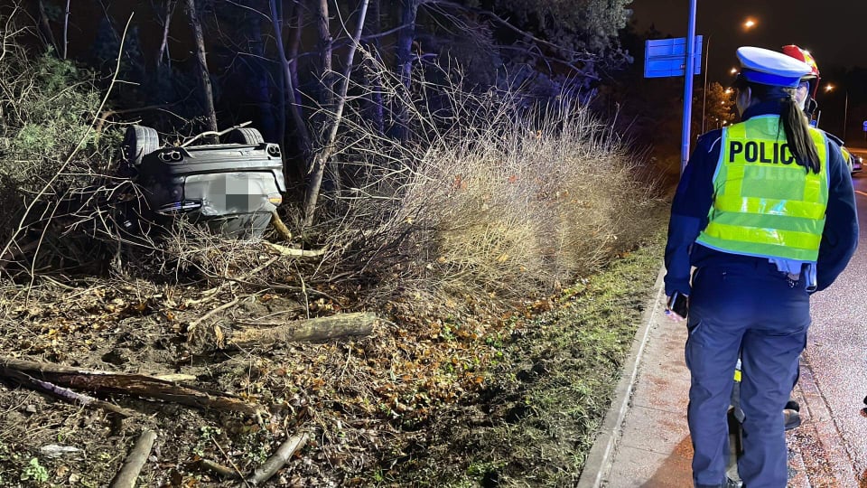 Dachowanie porsche na Białołęce. Kobieta w ciąży trafiła do szpitala. Zablokowana ulica